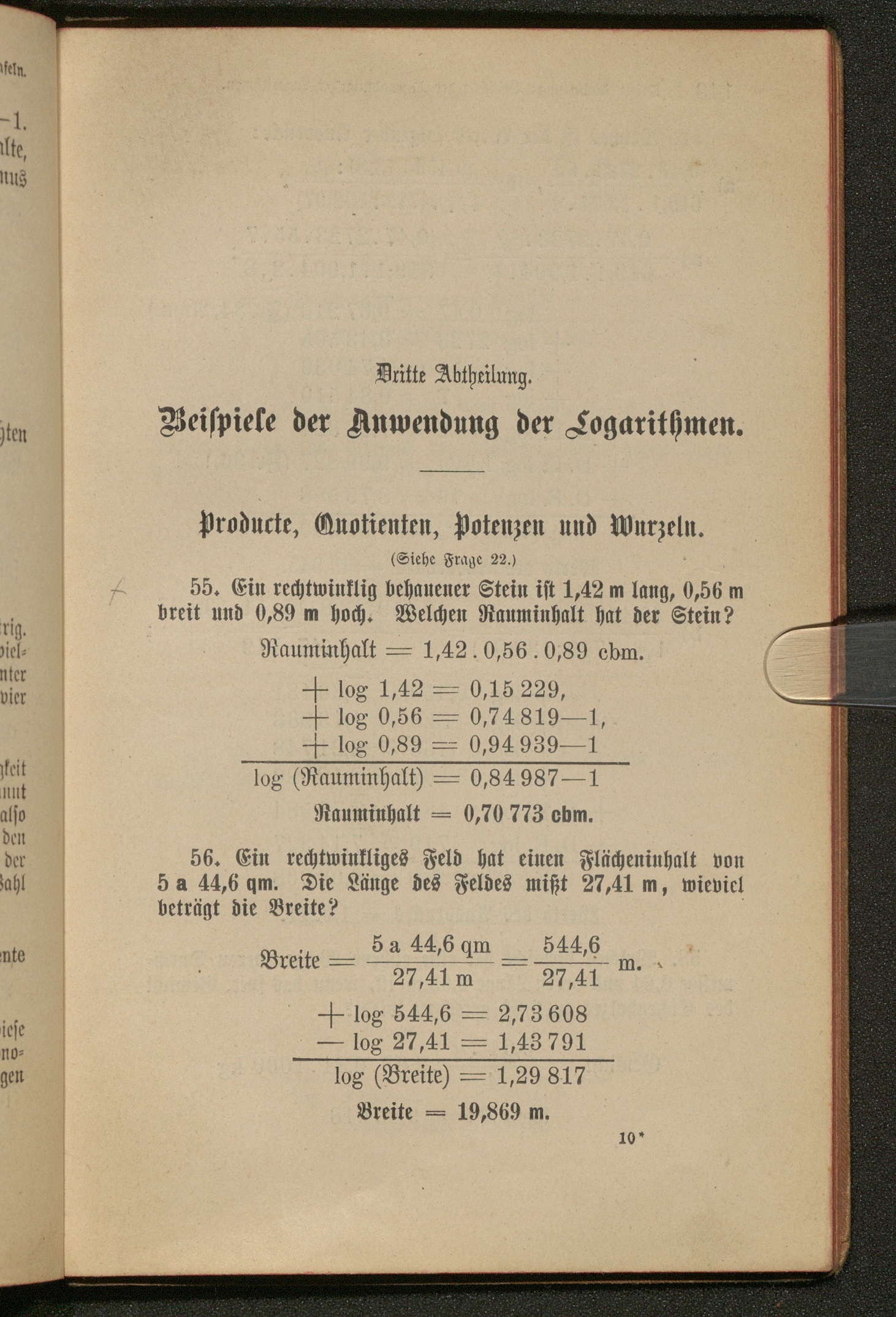 Dritte Abtheilung. Beispiele der Anwendung der Logarithmen