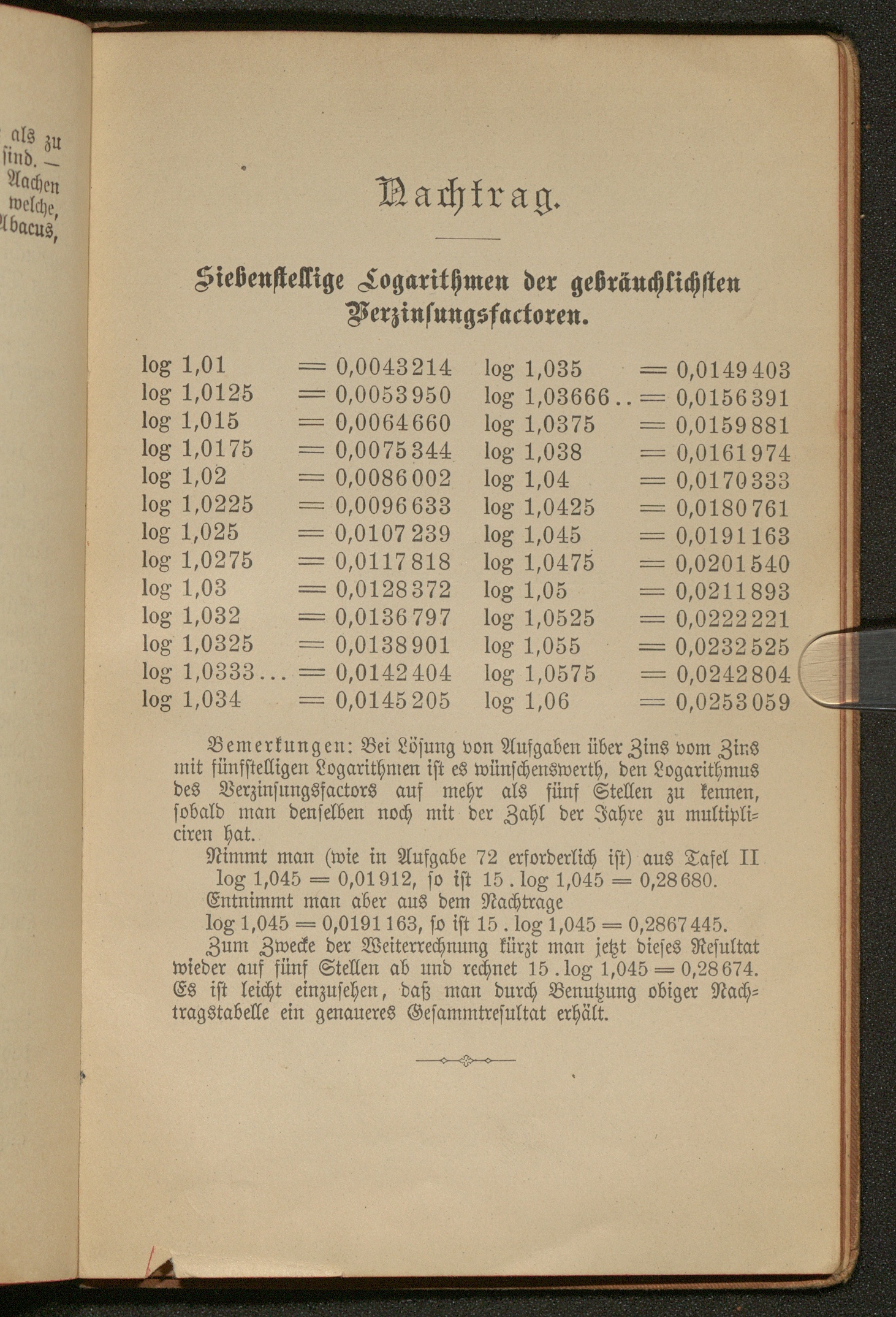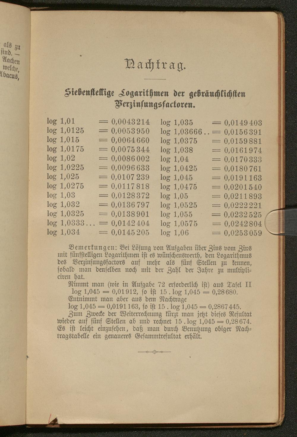 Nachtrag. Siebenstellige Logarithmen der gebräuchlichsten Verzinsungsfactoren