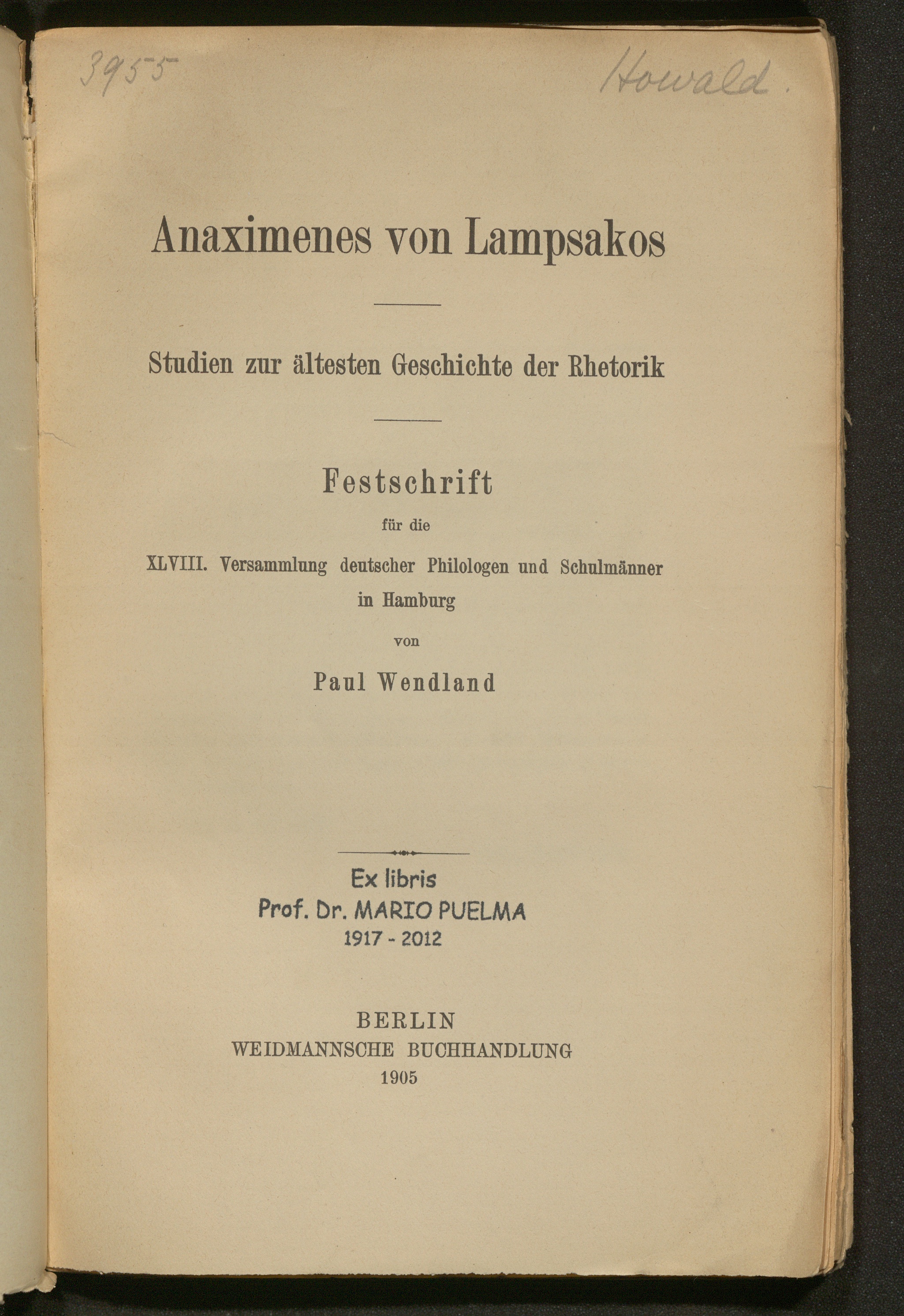 Anaximenes von Lampsakos : Studien zur ältesten Geschichte der Rhetorik : Festschrift für die XLVIII. Versammlung Deutscher Philologen und Schulmänner in Hamburg / von Paul Wendland
