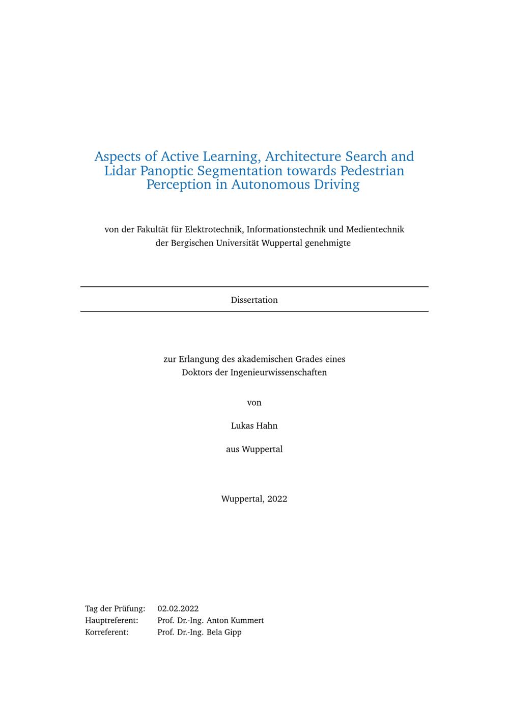 Aspects of active learning, architecture search and Lidar Panoptic Segmentation towards pedestrian perception in autonomous driving / von Lukas Hahn