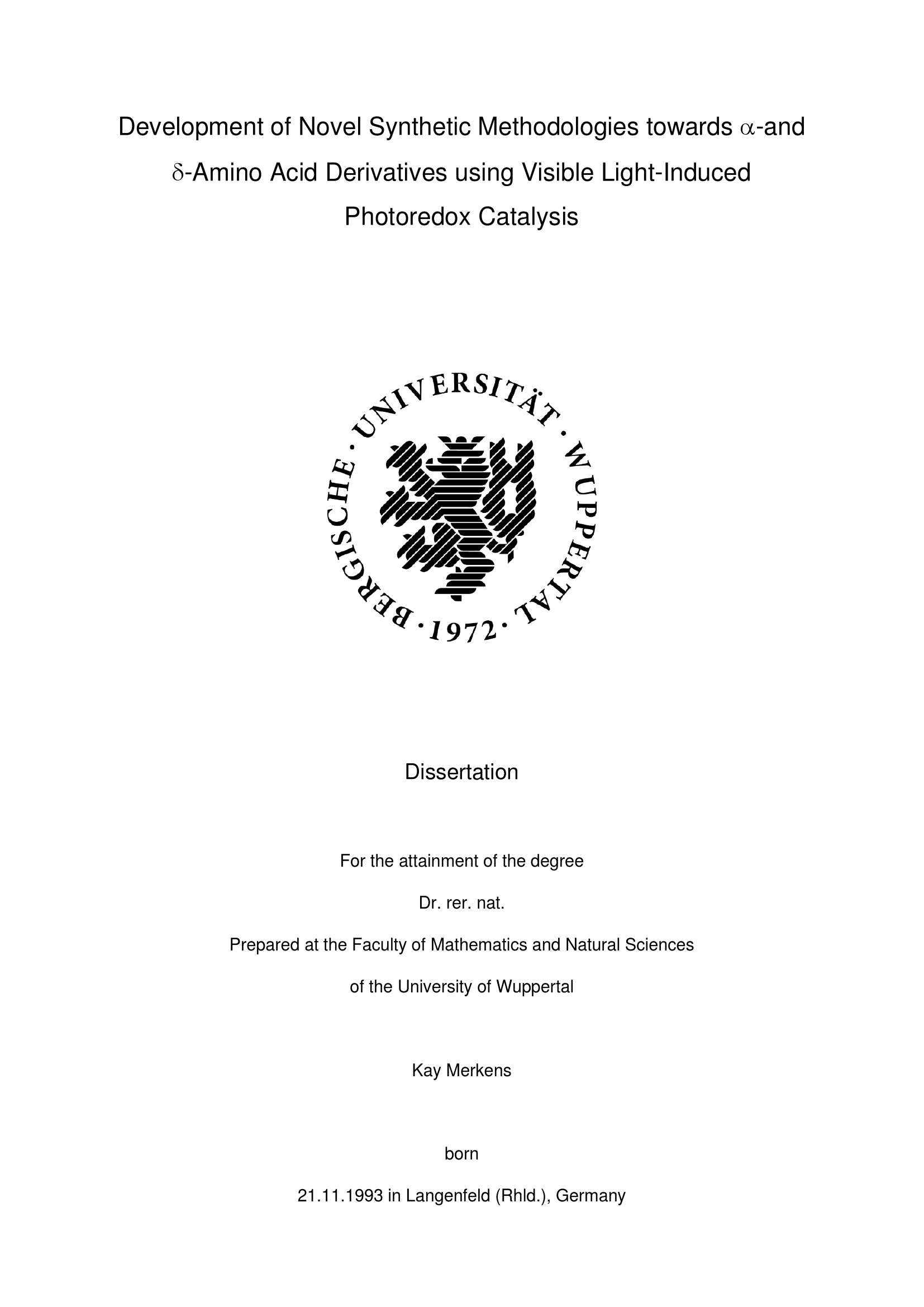 Development of novel synthetic methodologies towards α-and δ-Amino Acid Derivatives using Visible Light-Induced Photoredox Catalysis / Kay Merkens