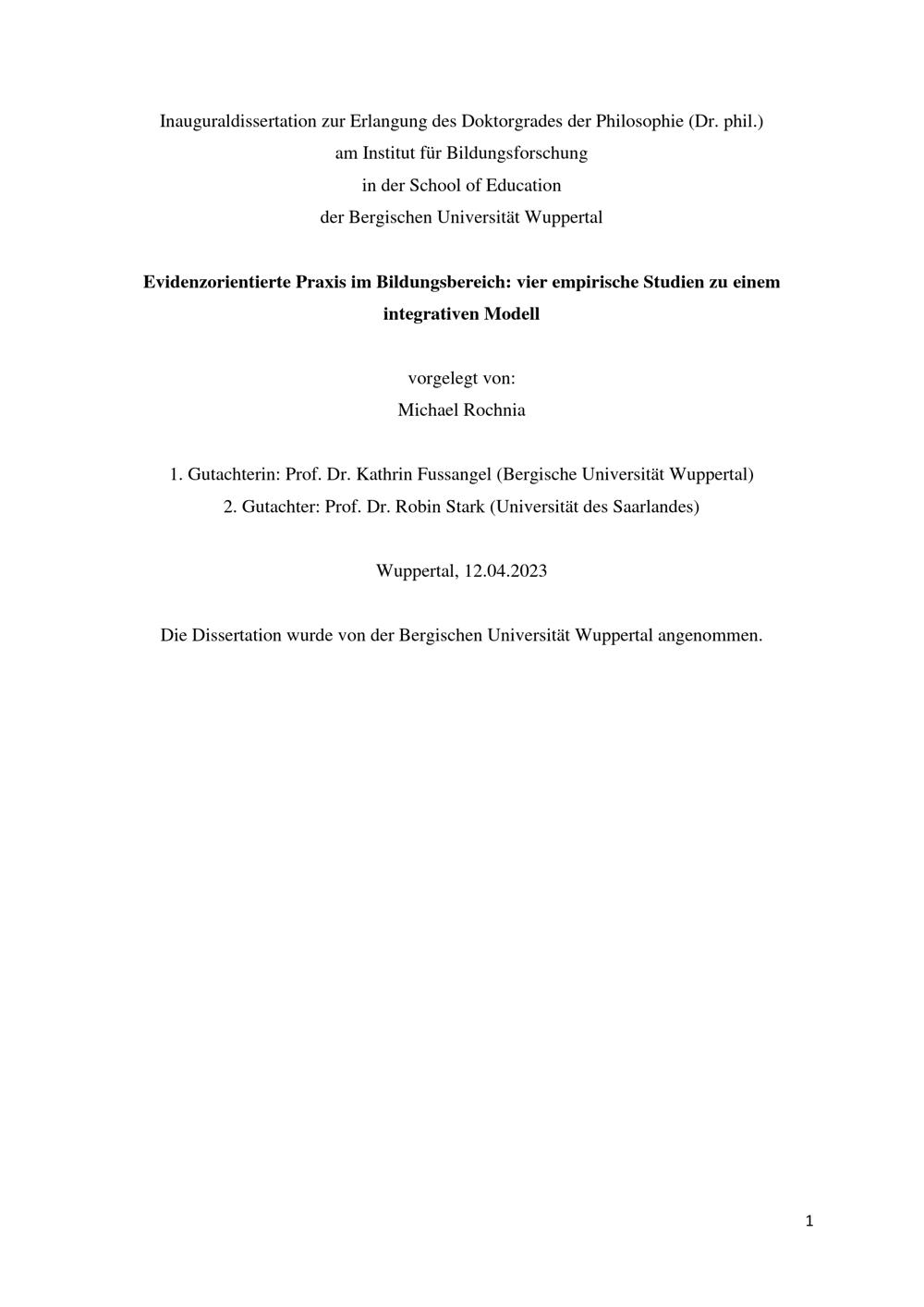 Evidenzorientierte Praxis im Bildungsbereich: vier empirische Studien zu einem integrativen Modell / vorgelegt von: Michael Rochnia
