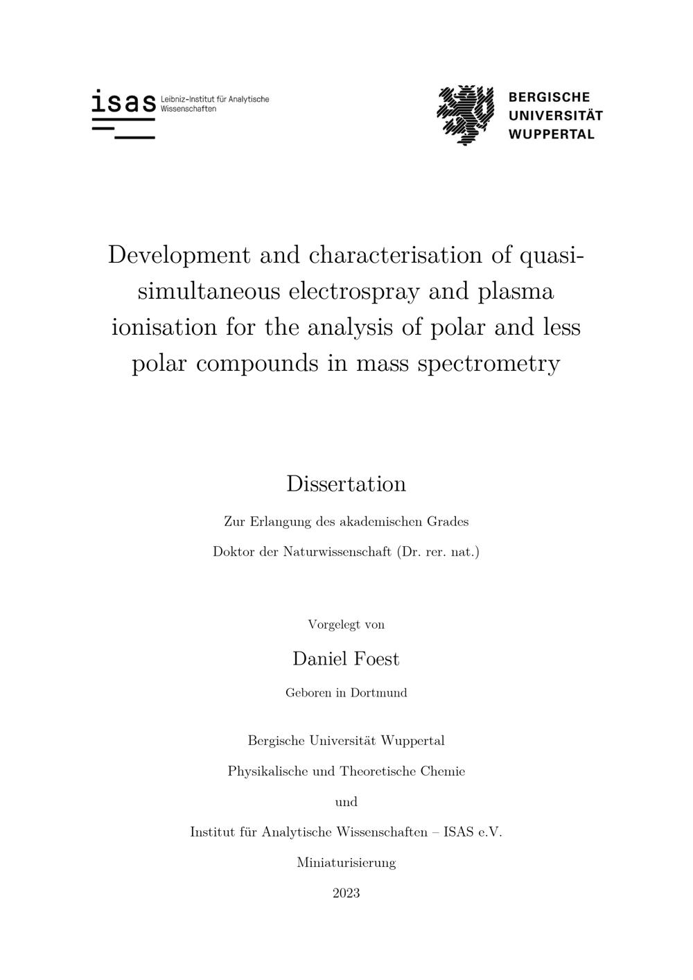 Development and characterisation of quasi-simultaneous electrospray and plasma ionisation for the analysis of polar and less polar compounds in mass spectrometry / vorgelegt von Daniel Foest