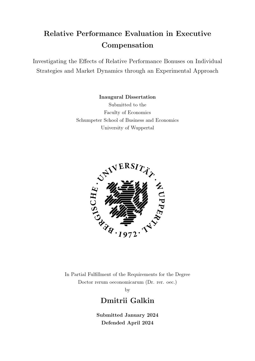 Relative performance evaluation in executive compensation : investigating the effects of relative performance bonuses on individual strategies and market dynamics through an experimental approach / by Dmitrii Galkin