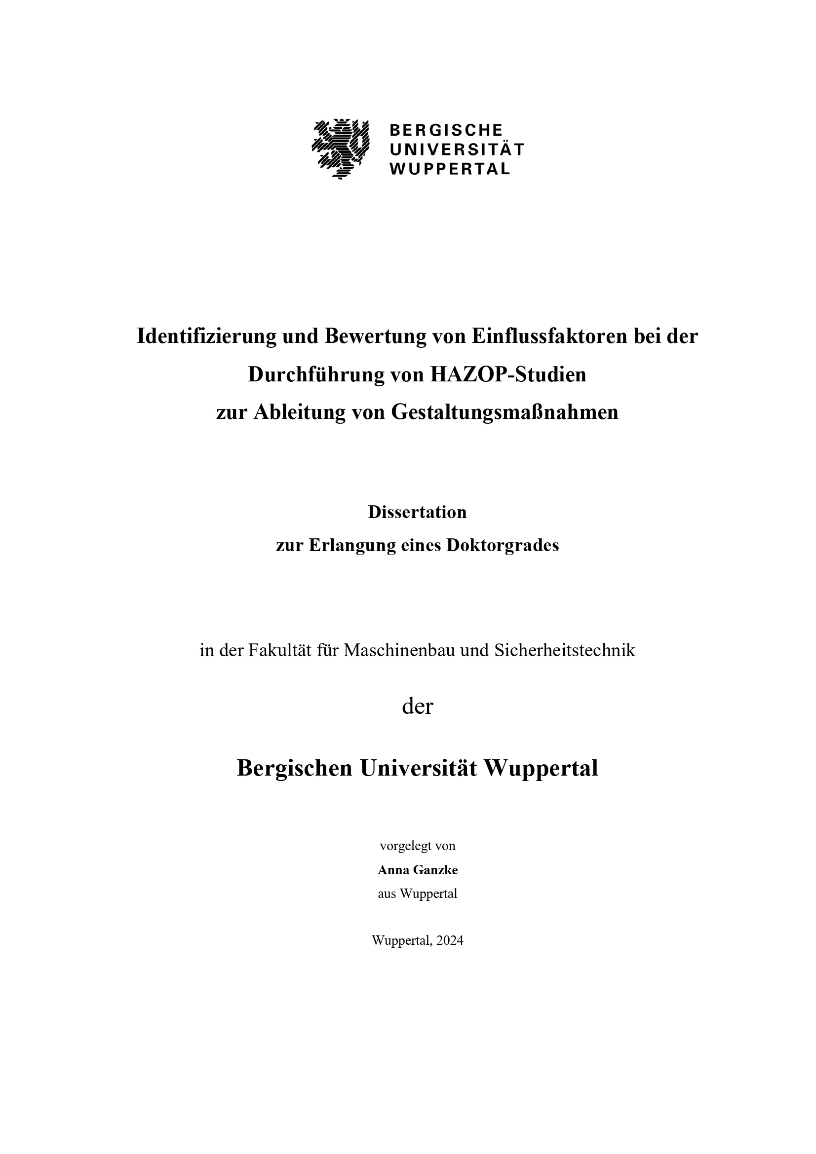 Identifizierung und Bewertung von Einflussfaktoren bei der Durchführung von HAZOP-Studien zur Ableitung von Gestaltungsmaßnahmen / vorgelegt von Anna Ganzke