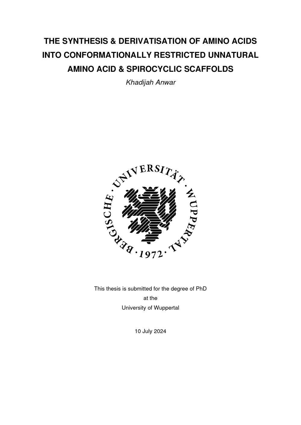 The synthesis & derivatisation of amino acids into conformationally restricted unnatural amino acid & spirocyclic scaffolds / Khadijah Anwar