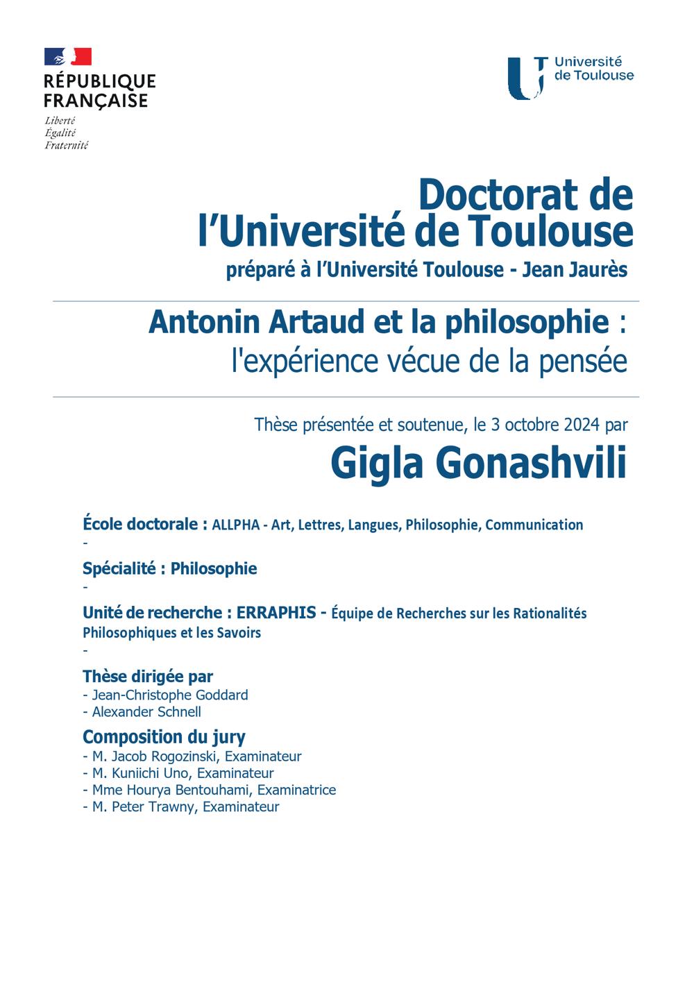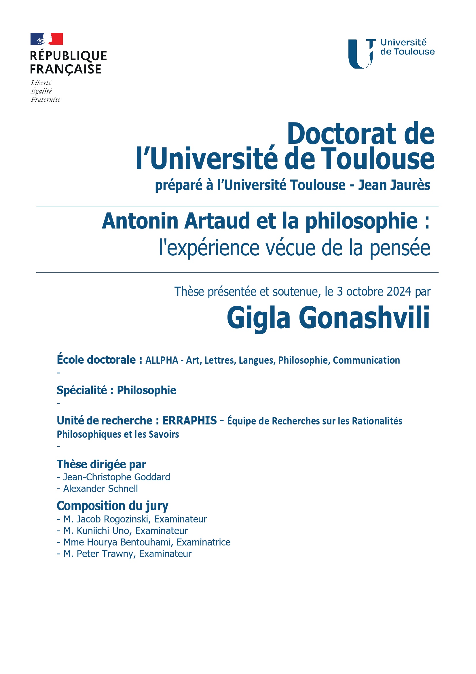 Antonin Artaud et la philosophie : l'expérience vécue de la pensée / Gigla Gonashvilli