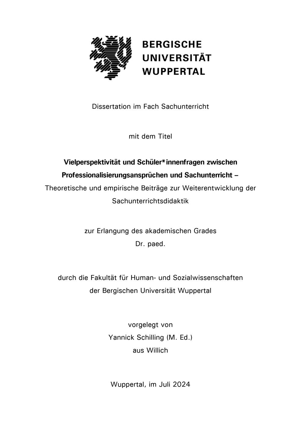 Vielperspektivität und Schüler*innenfragen zwischen Professionalisierungsansprüchen und Sachunterricht : Theoretische und empirische Beiträge zur Weiterentwicklung der Sachunterrichtsdidaktik / vorgelegt von Yannick Schilling (M. Ed.) aus Willich