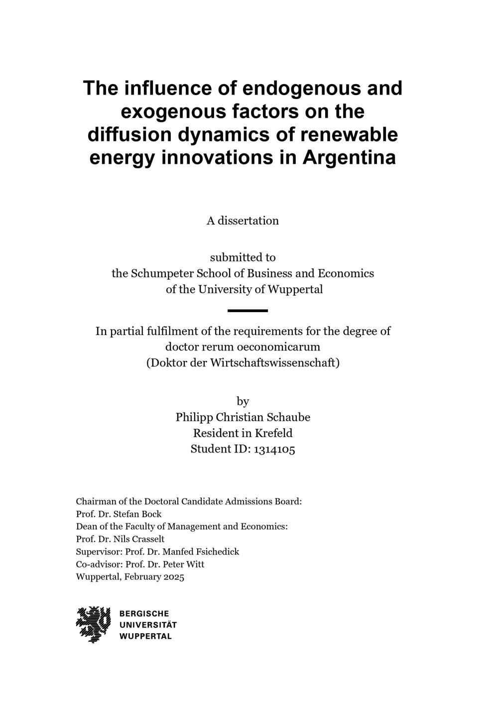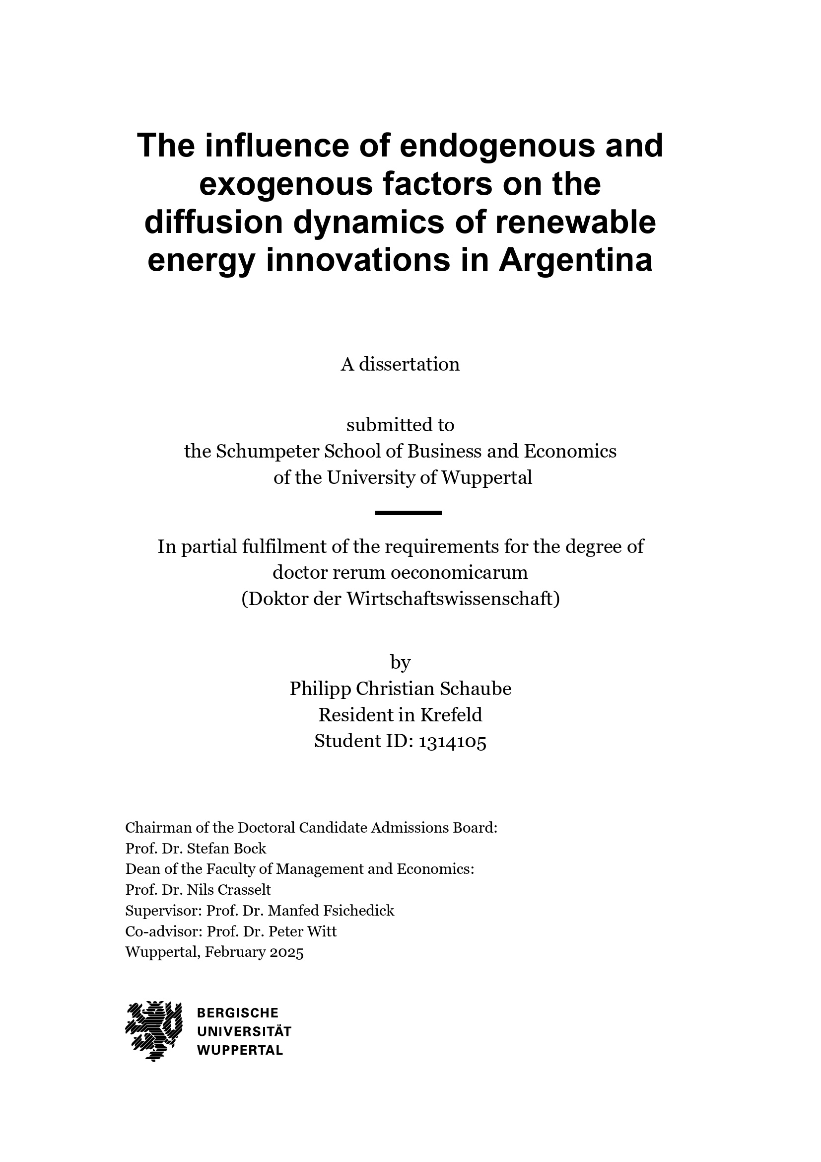 The influence of endogenous and exogenous factors on the diffusion dynamics of renewable energy innovations in Argentina / by Philipp Christian Schaube