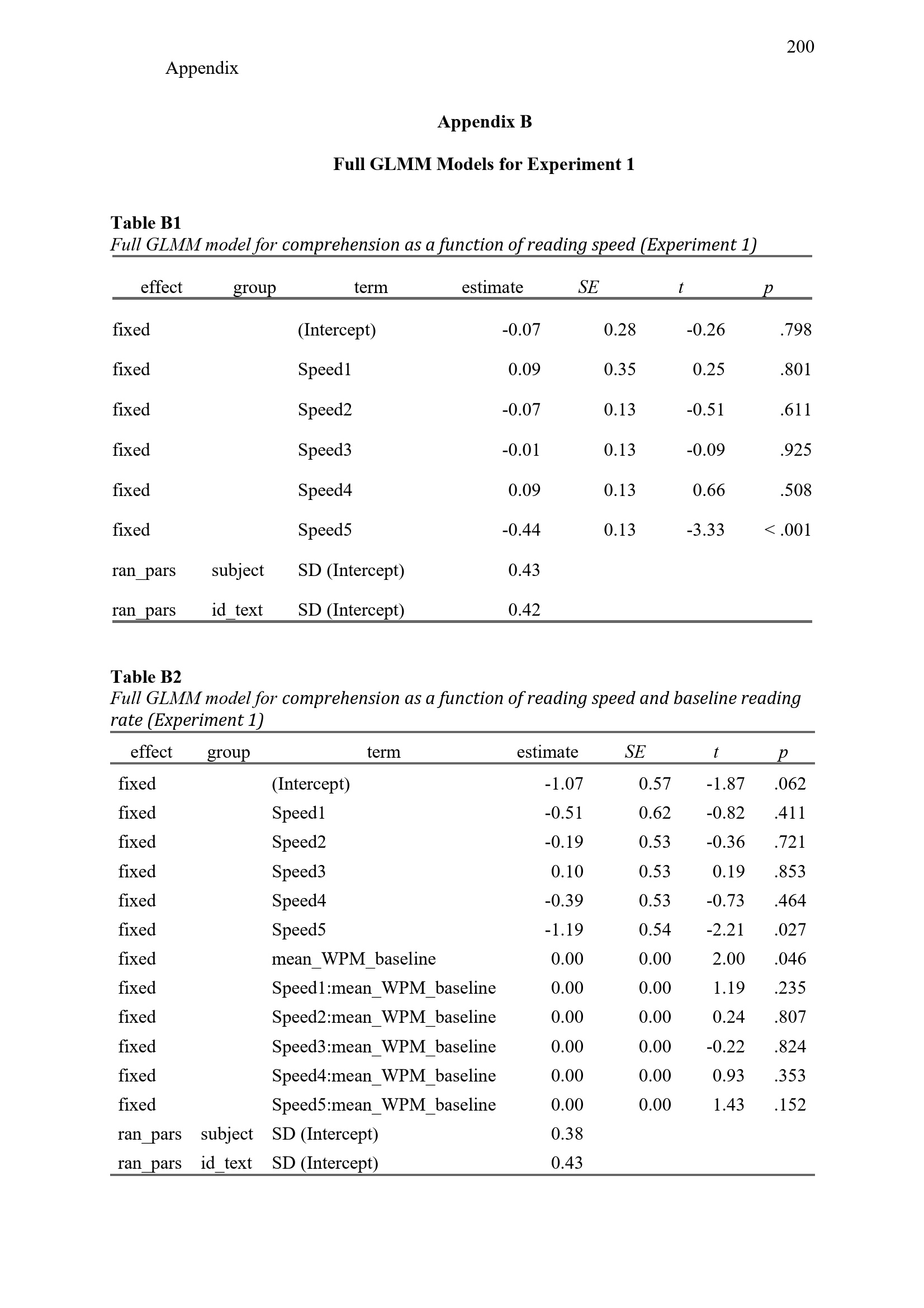 Appendix B Full GLMM Models for Experiment 1