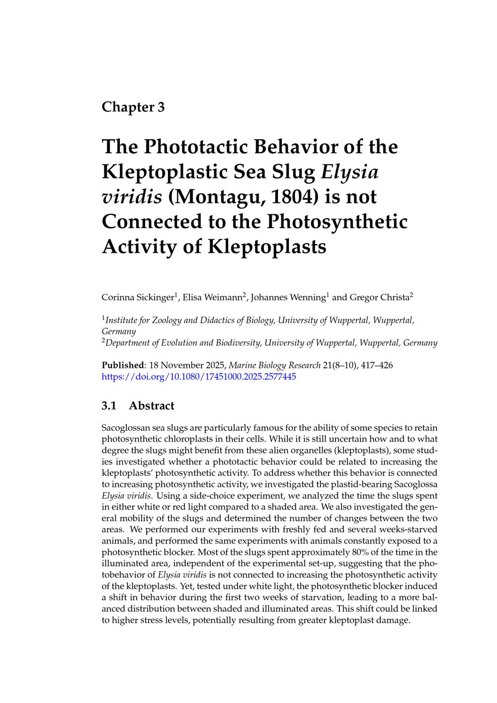 The Phototactic Behavior of the Kleptoplastic Sea Slug Elysia viridis (Montagu, 1804)[...]