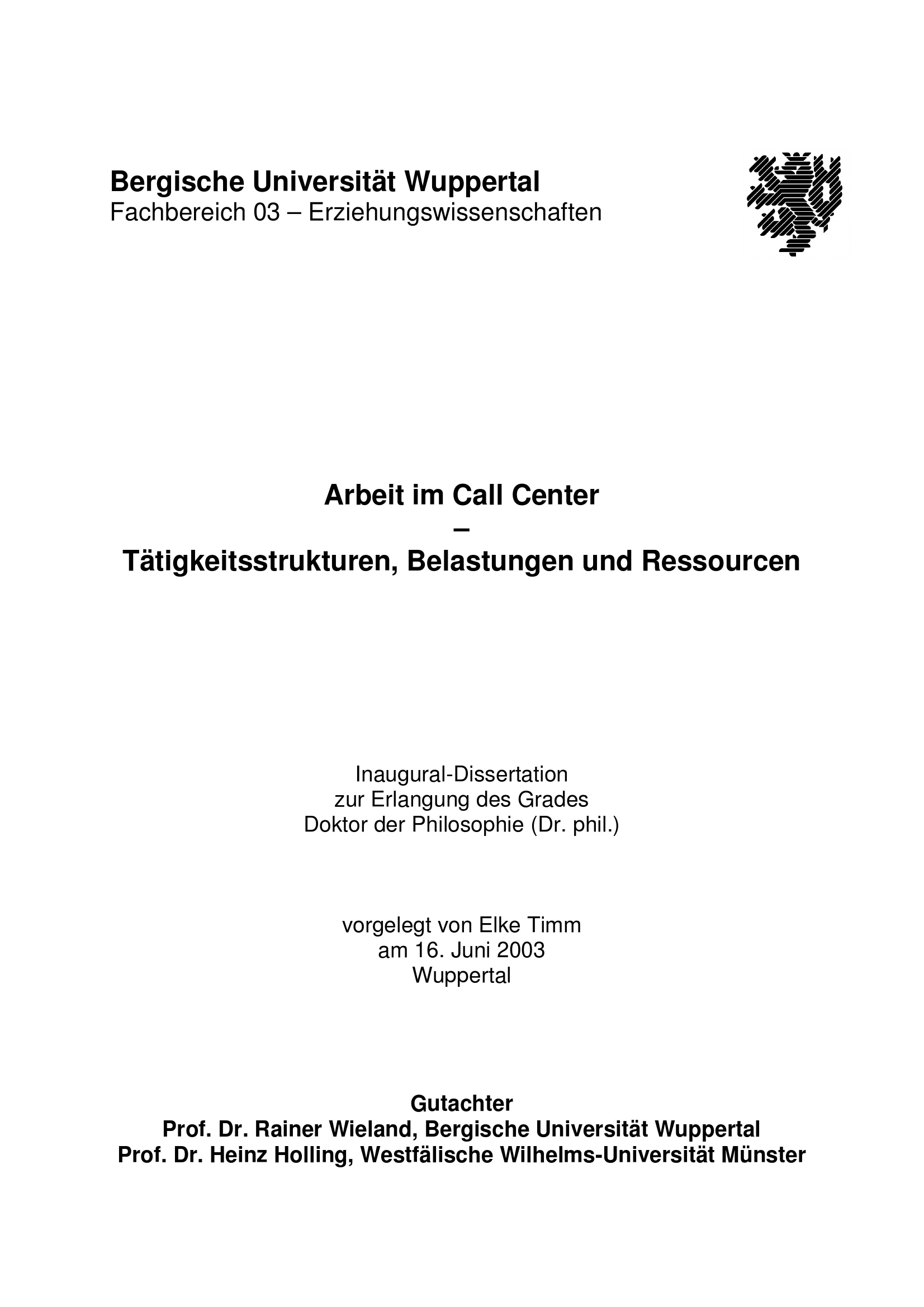 Arbeit im Call-Center : Tätigkeitsstrukturen, Belastungen und Ressourcen / vorgelegt von Elke Timm
