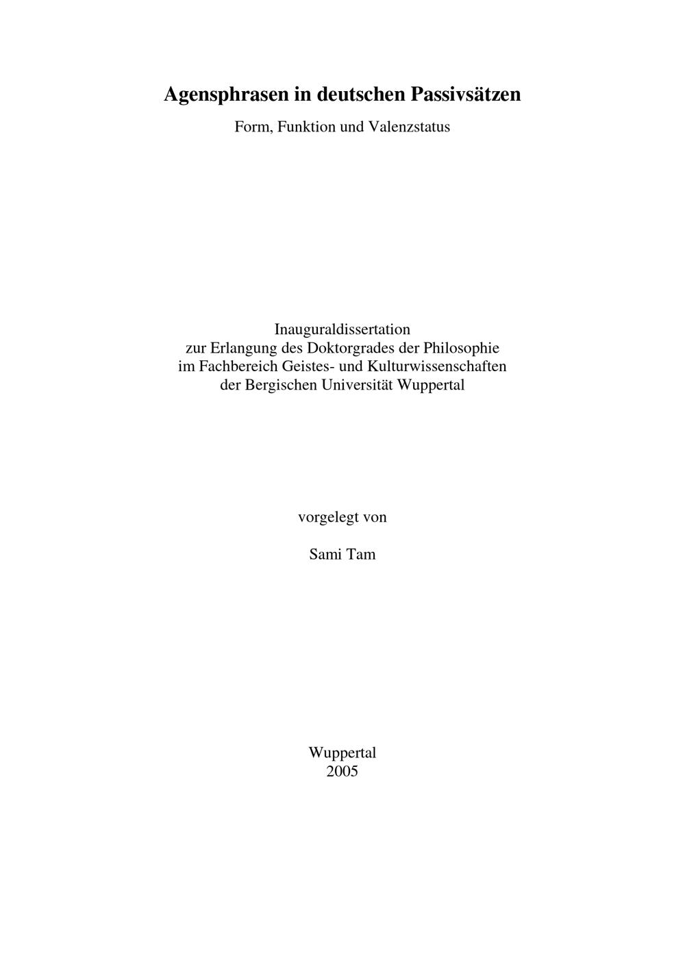 Agensphrasen in deutschen Passivsätzen : Form, Funktion und Valenzstatus / vorgelegt von Sami Tam