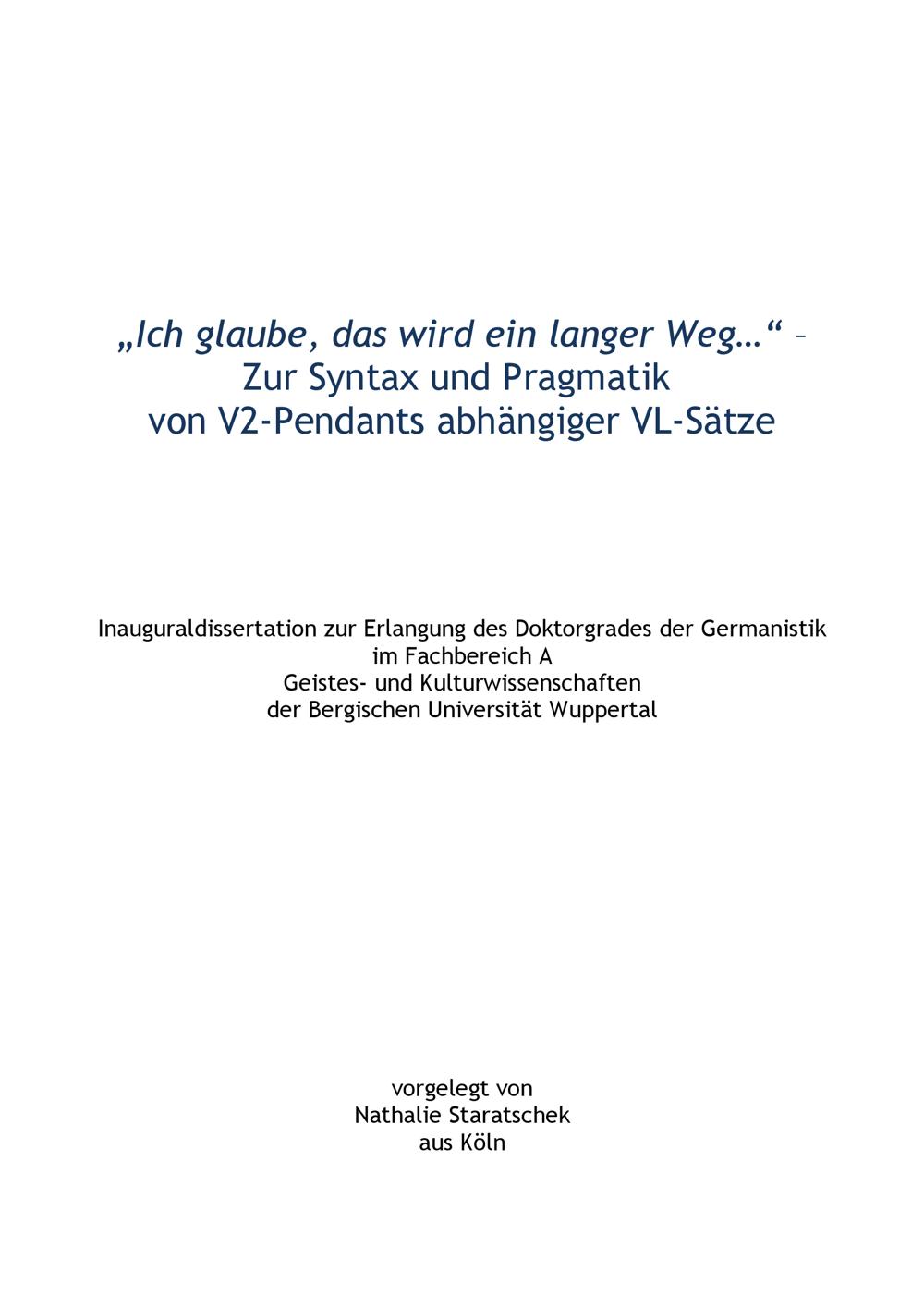 "Ich glaube, das wird ein langer Weg ..." - Zur Syntax und Pragmatik von V2-Pendants abhängiger VL-Sätze / vorgelegt von Nathalie Staratschek aus Köln