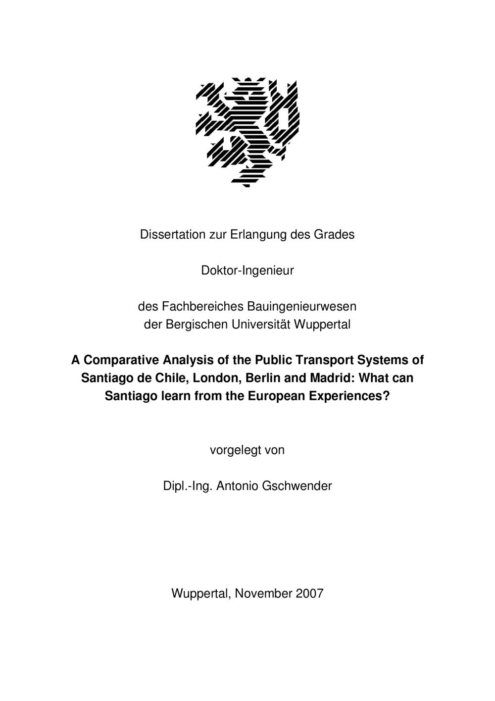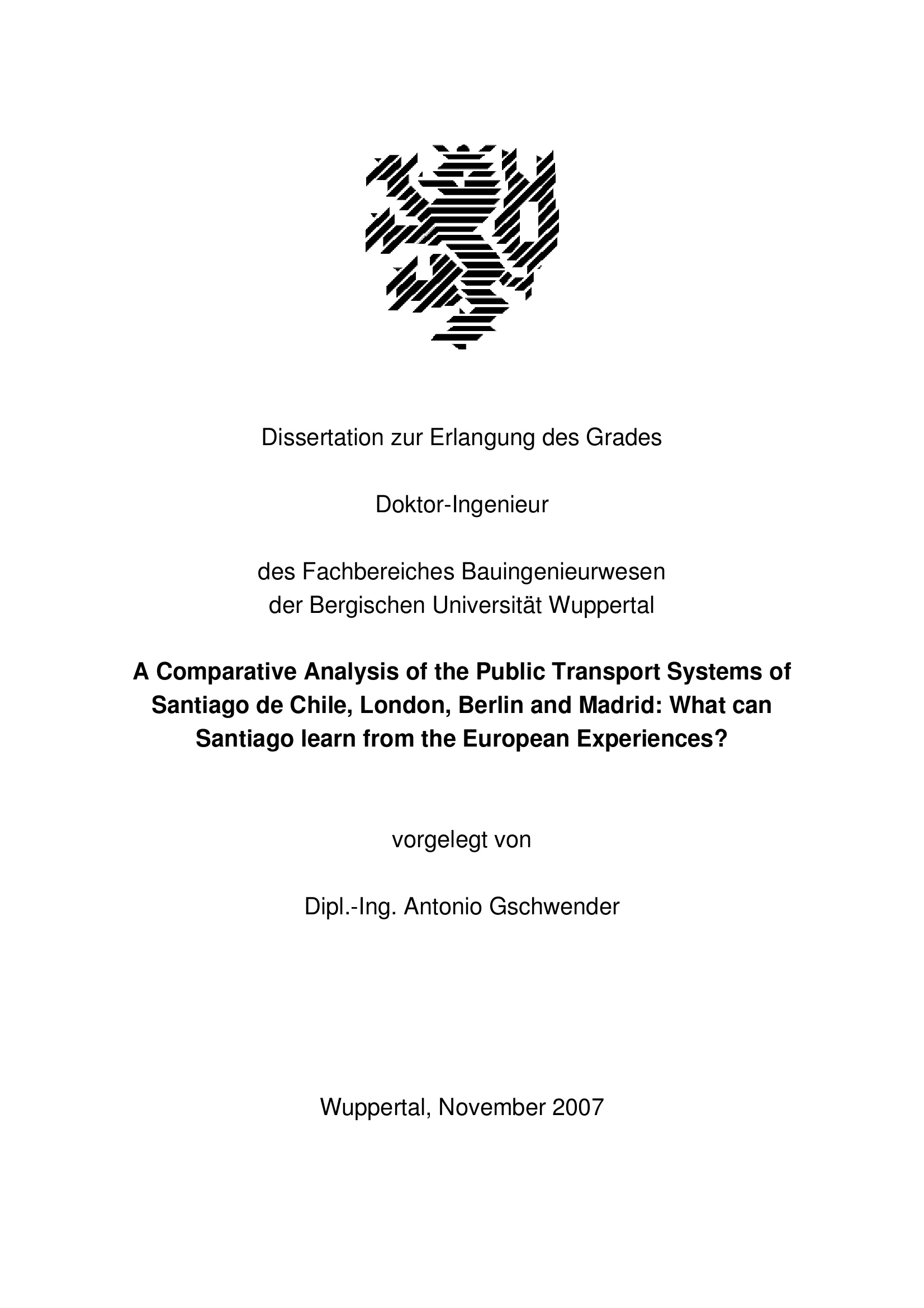 A comparative analysis of the public transport systems of Santiago de Chile, London, Berlin and Madrid : what can Santiago learn from the European experiences? / Vorgelegt von Antonio Gschwender
