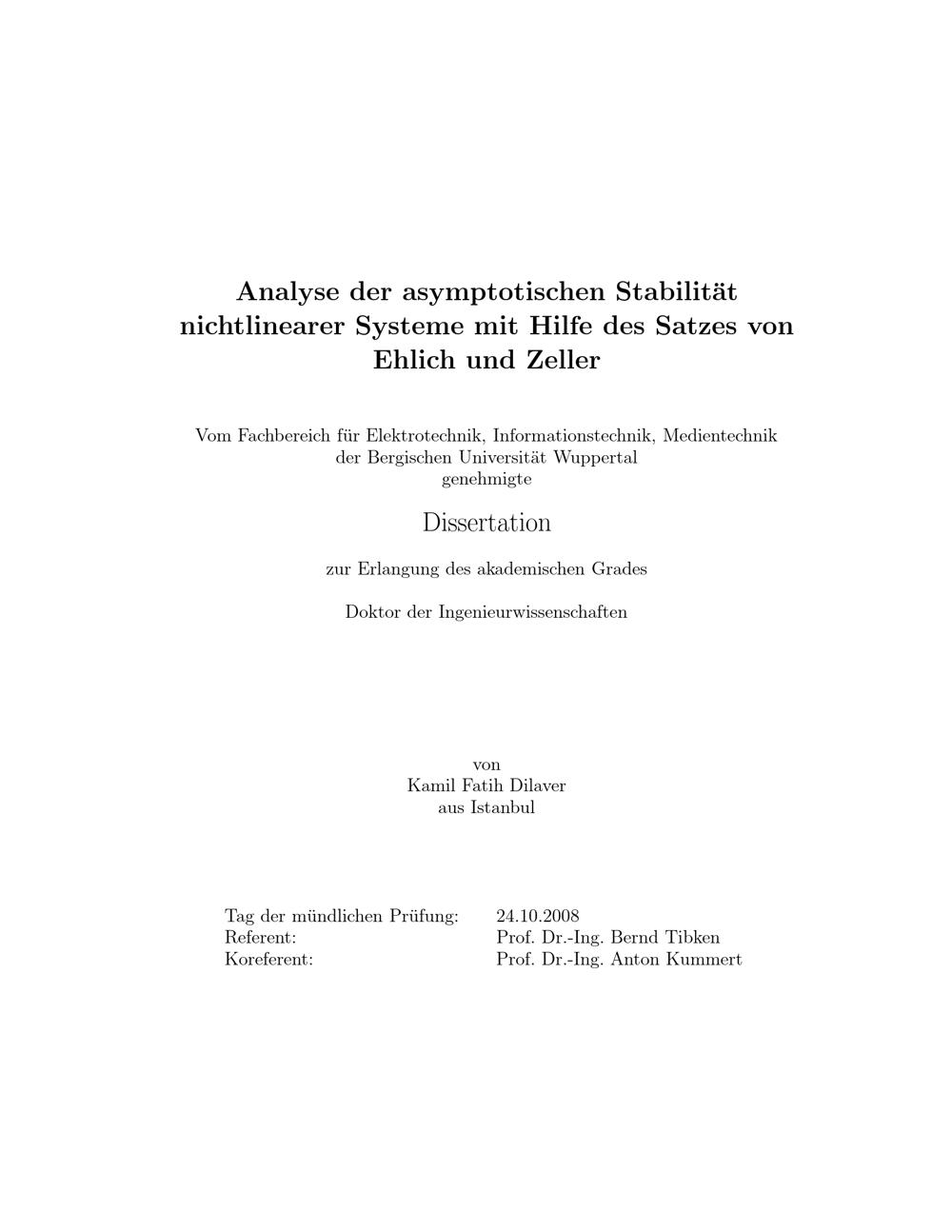 Analyse der asymptotischen Stabilität nichtlinearer Systeme mit Hilfe des Satzes von Ehlich und Zeller / von Kamil Fatih Dilaver