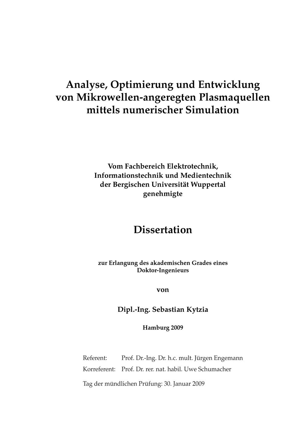 Analyse, Optimierung und Entwicklung von mikrowellen-angeregten Plasmaquellen mittels numerischer Simulation / von Sebastian Kytzia