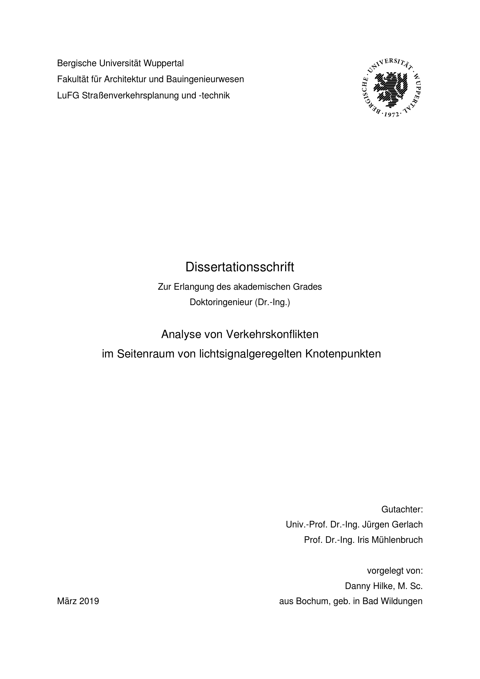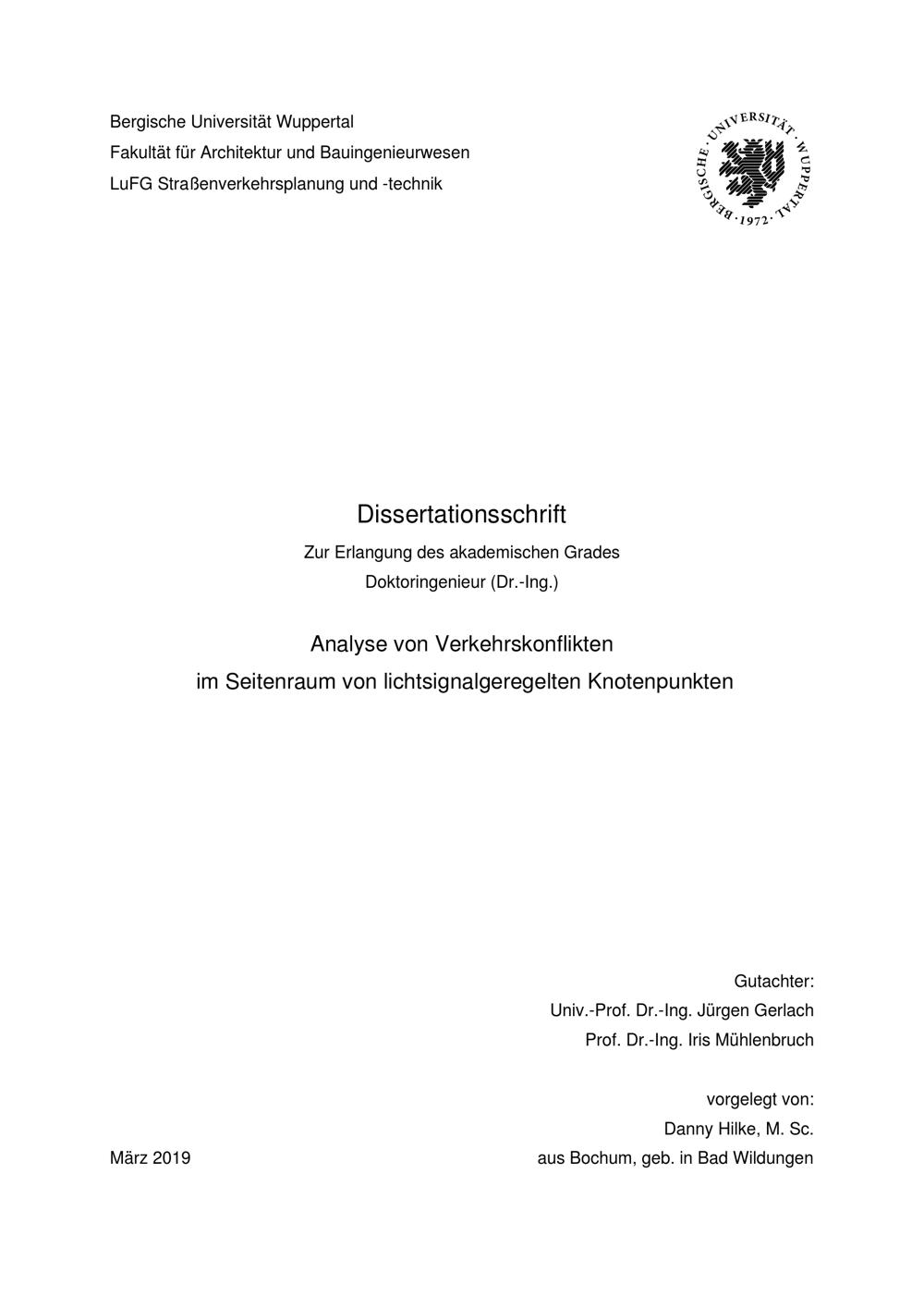 Analyse von Verkehrskonflikten im Seitenraum von lichtsignalgeregelten Knotenpunkten / vorgelegt von: Danny Hilke, M. Sc. aus Bochum, geb. in Bad Wildungen