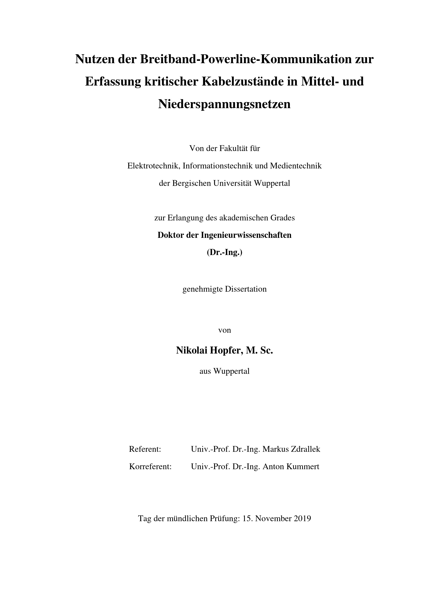 Nutzen der Breitband-Powerline-Kommunikation zur Erfassung kritischer Kabelzustände in Mittel- und Niederspannungsnetzen / von Nikolai Hopfer, M.Sc. aus Wuppertal