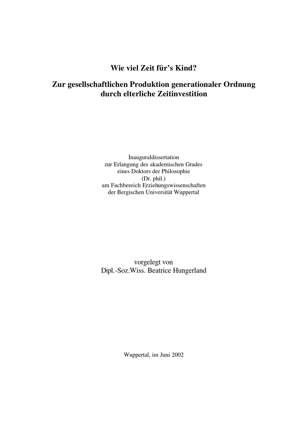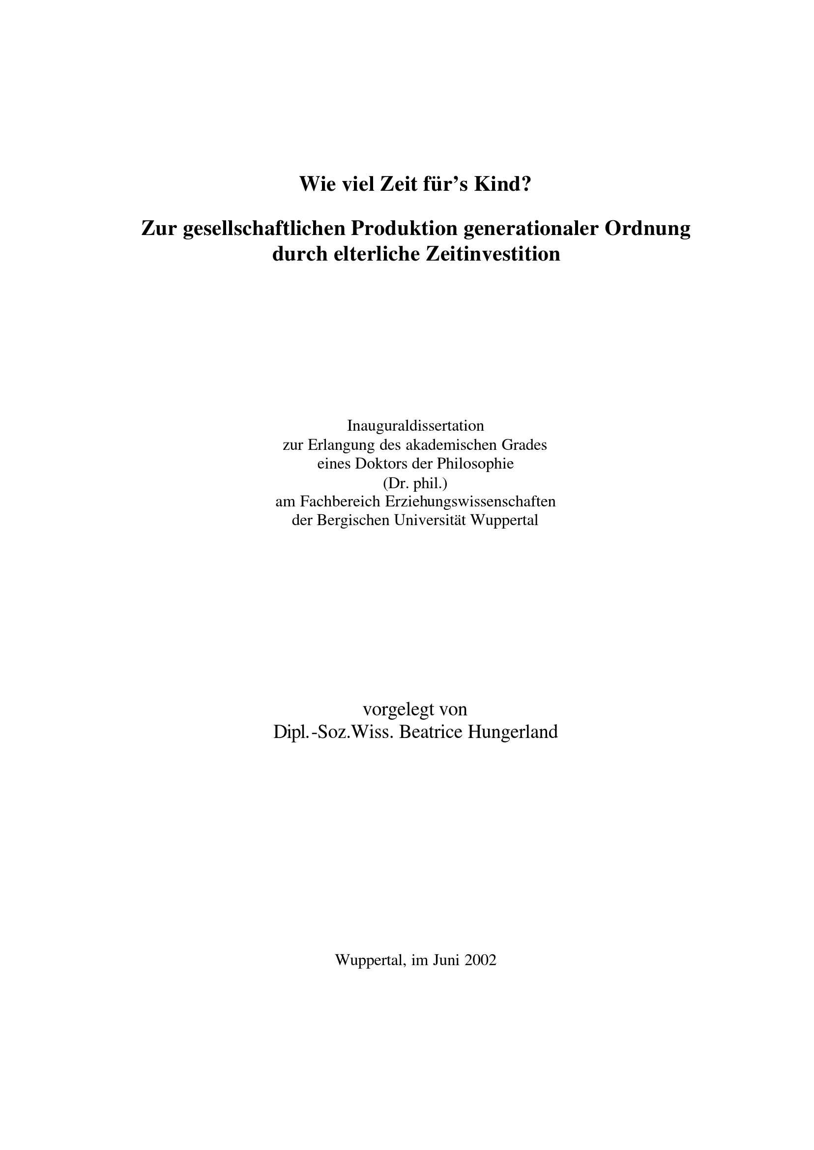 Wie viel Zeit für's Kind? : zur gesellschaftlichen Produktion generationaler Ordnung durch elterliche Zeitinvestition / vorgelegt von Beatrice Hungerland