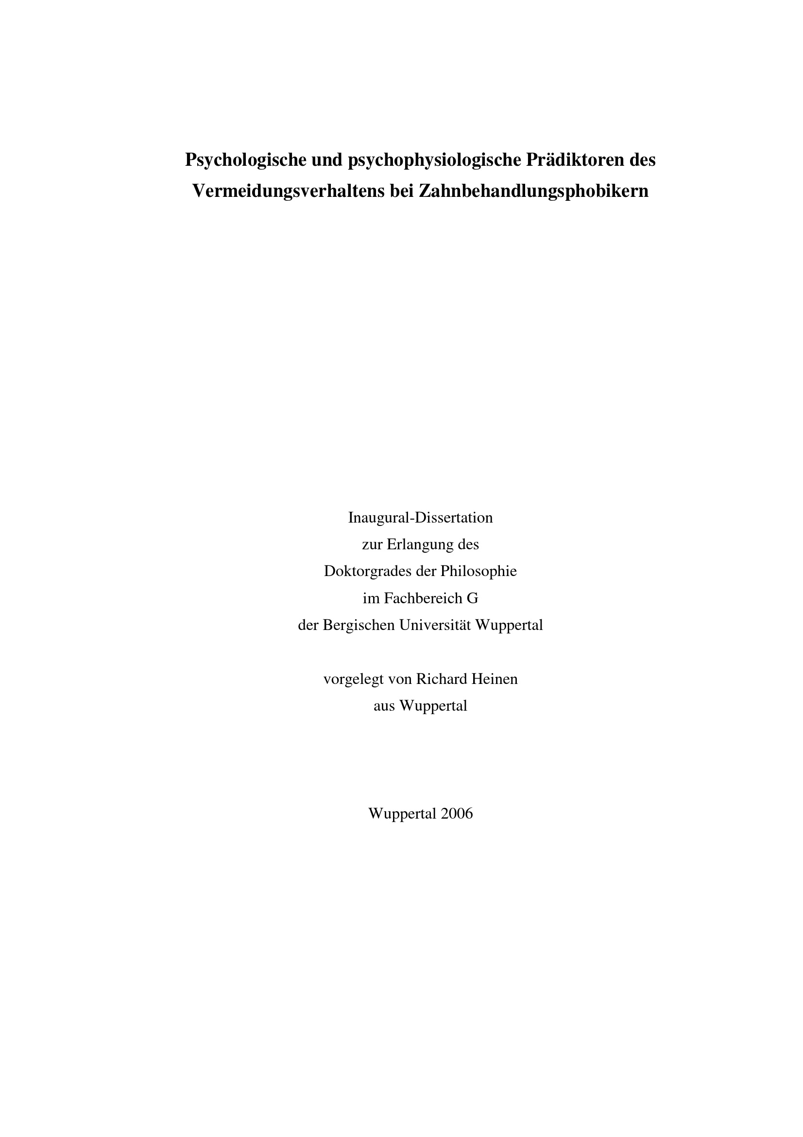 Psychologische und psychophysiologische Prädiktoren des Vermeidungsverhaltens bei Zahnbehandlungsphobikern / vorgelegt von Richard Heinen