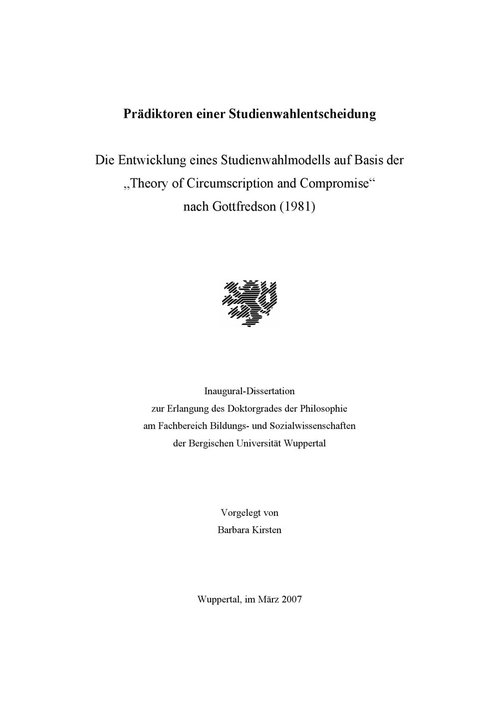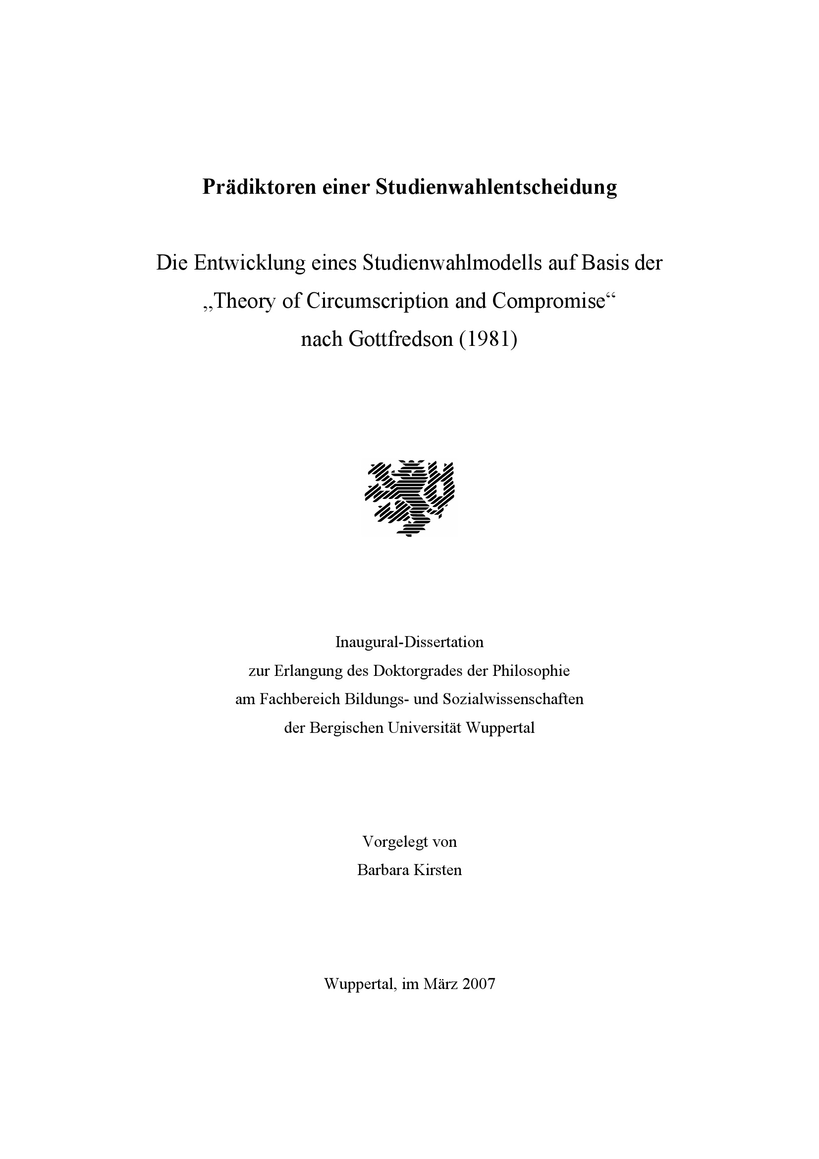 Prädiktoren einer Studienwahlentscheidung : die Entwicklung eines Studienwahlmodells auf Basis der "Theory of circumscription and compromise" nach Gottfredson (1981) / vorgelegt von Barbara Kirsten