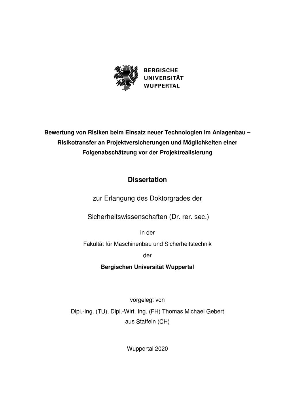 Bewertung von Risiken beim Einsatz neuer Technologien im Anlagenbau : Risikotransfer an Projektversicherungen und Möglichkeiten einer Folgenabschätzung vor der Projektrealisierung / vorgelegt von Dipl.-Ing. (TU), Dipl.-Wirt. Ing. (FH) Thomas Michael Gebert aus Staffeln (CH)