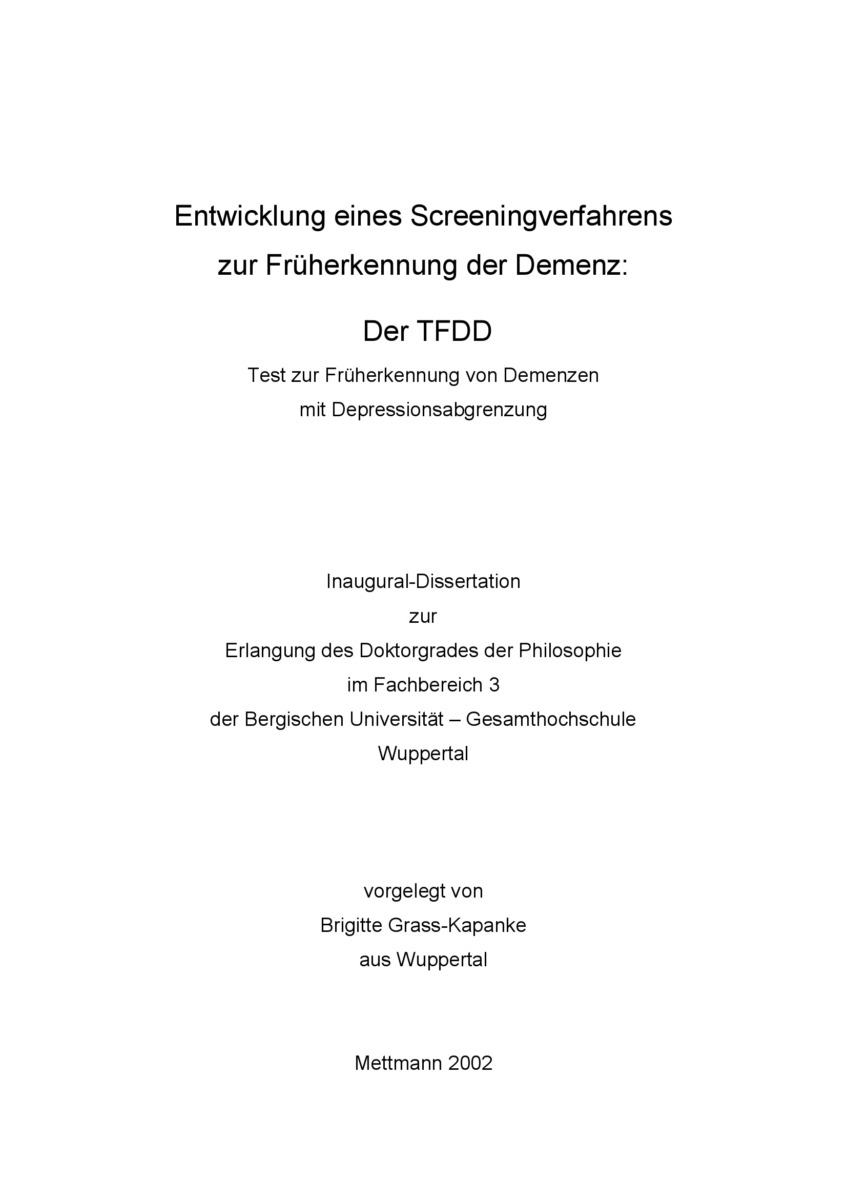 Entwicklung eines Screeningverfahrens zur Früherkennung der Demenz : der TFDD, Test zur Früherkennung von Demenzen mit Depressionsabgrenzung / vorgelegt von Brigitte Grass-Kapanke
