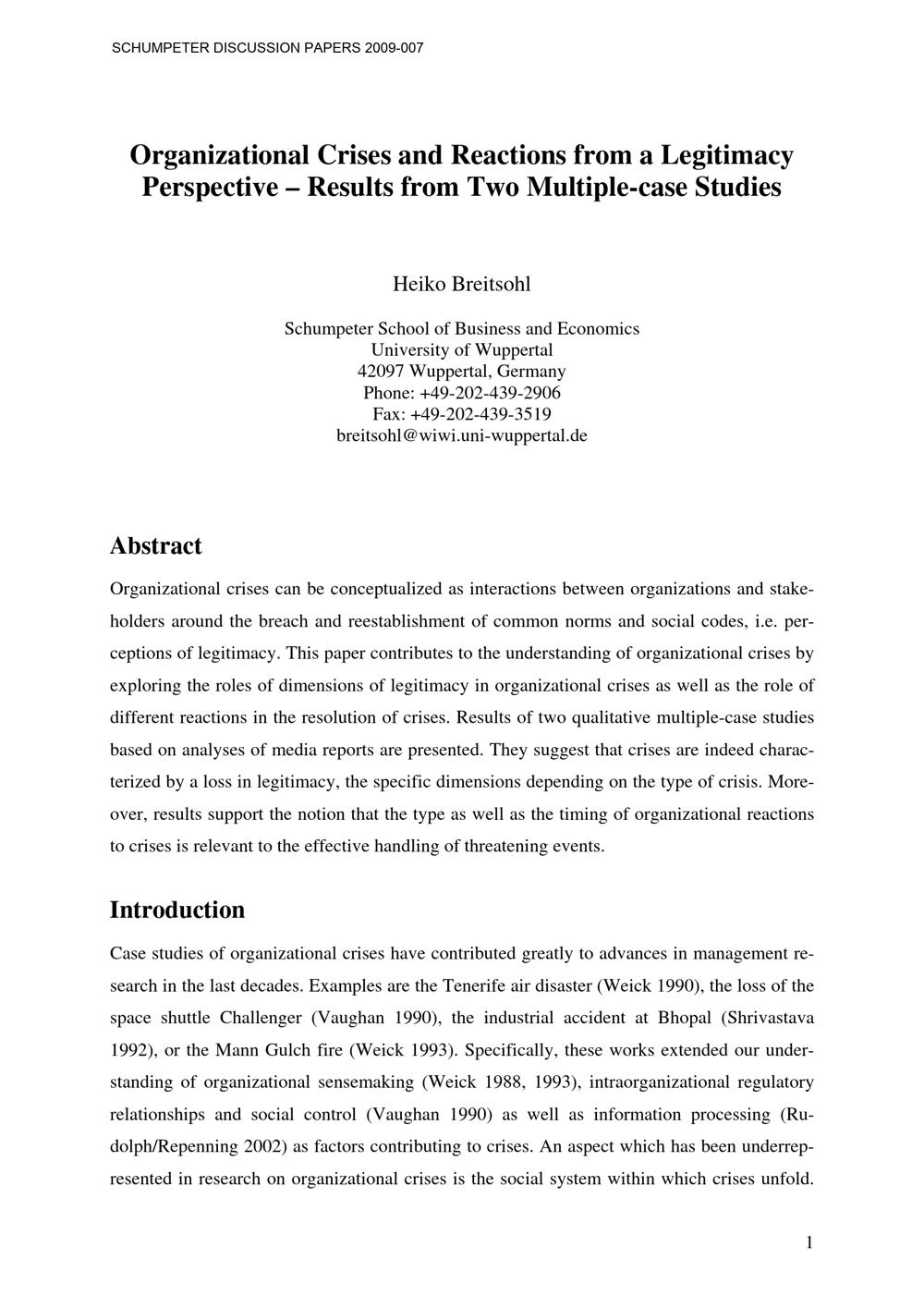 Organisationale Reaktionen auf Krisen : eine Analyse der Wirkungszusammenhänge aus Legitimitätsperspektive / vorgelegt von Heiko Breitsohl