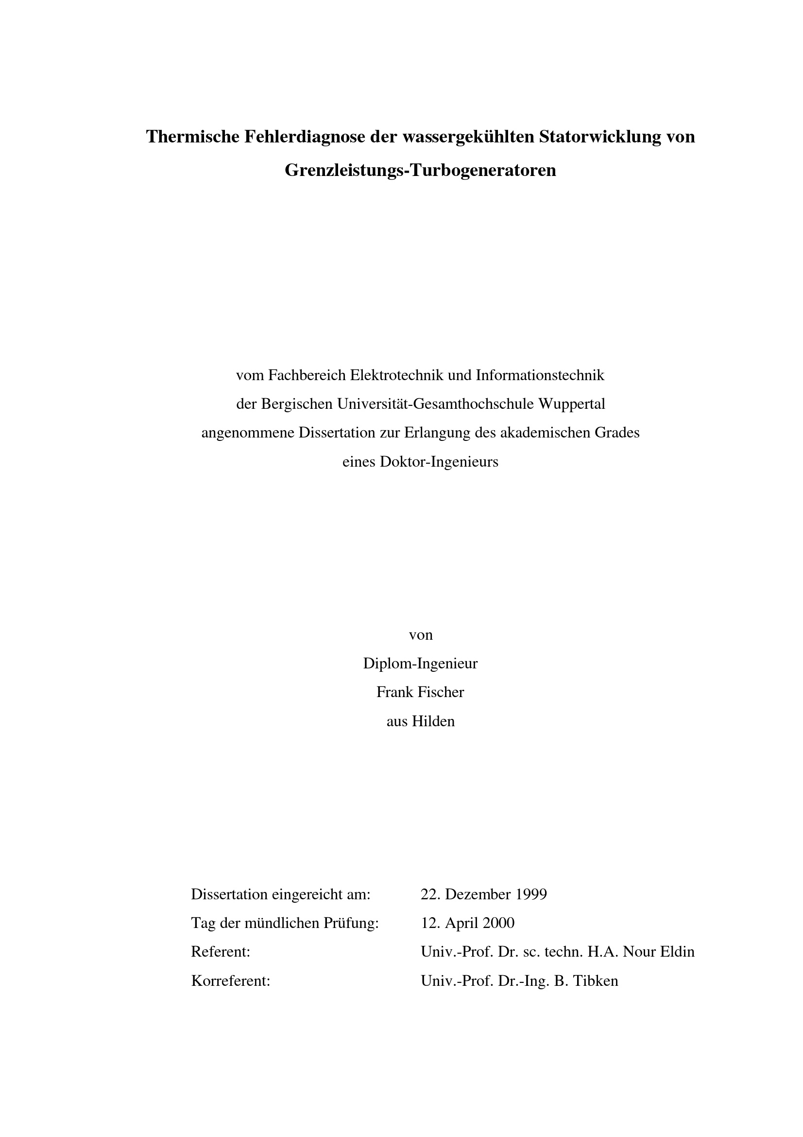 Thermische Fehlerdiagnose der wassergekühlten Statorwicklung von Grenzleistungs-Turbogeneratoren / von Frank Fischer