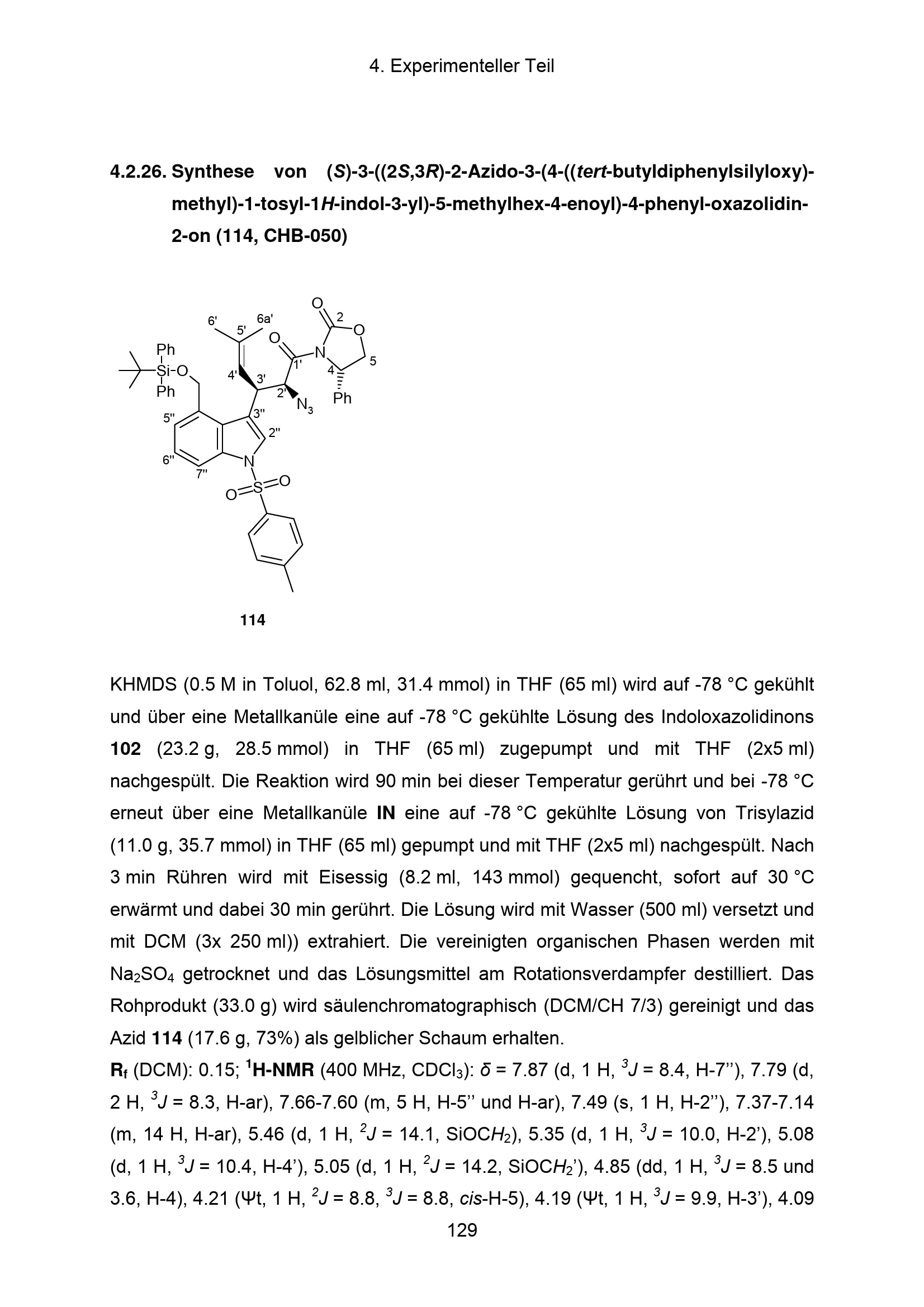 4.2.26. Synthese von (S)-3-((2S,3R)-2-Azido-3-(4-((tert-butyldiphenylsilyloxy)-methyl)-1-tosyl-1H-indol-3-yl)-5-methylhex-4-enoyl)-4-phenyl-oxazolidin-2-on[...]