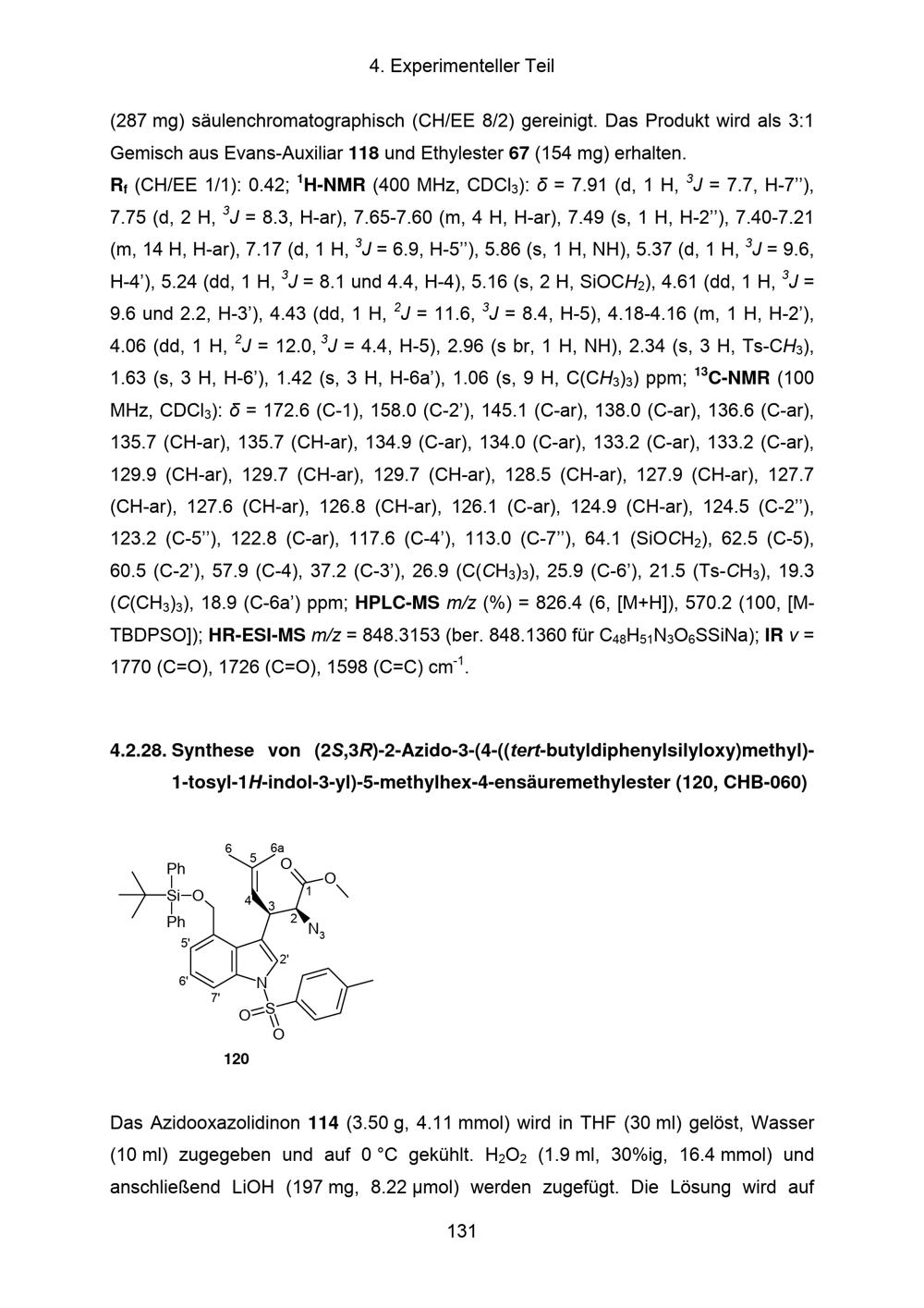 4.2.28. Synthese von (2S,3R)-2-Azido-3-(4-((tert-butyldiphenylsilyloxy)methyl)-1-tosyl-1H-indol-3-yl)-5-methylhex-4-ensäuremethylester[...]
