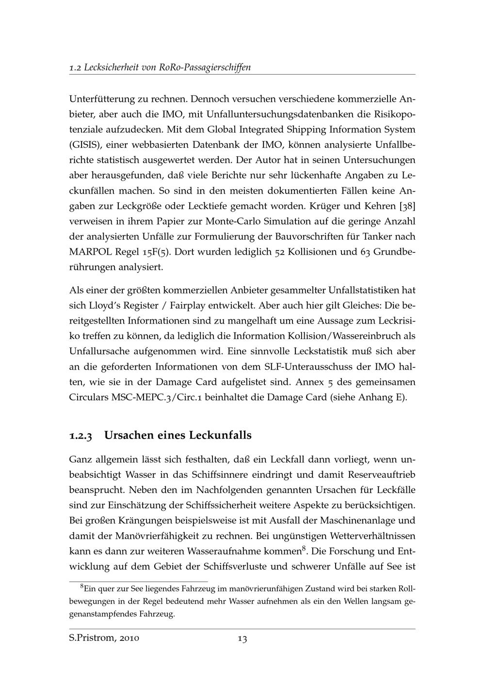 Untersuchung zur Einschätzung von Schwimmlage und Stabilität an Bord von RoRo und RoRo-Passagierschiffen im Wassereinbruchfall / von Sascha Pristrom