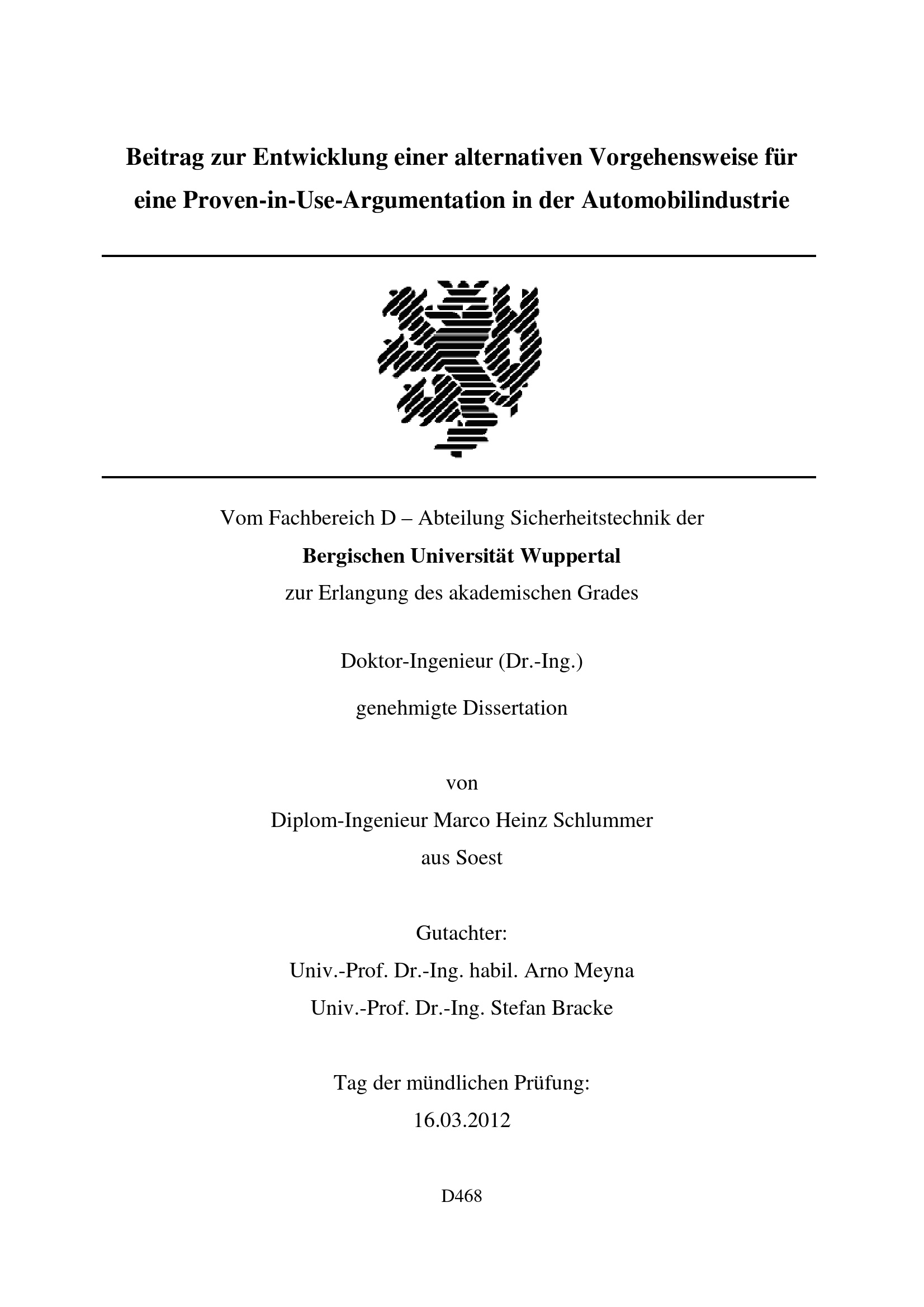 Beitrag zur Entwicklung einer alternativen Vorgehensweise für eine Proven-in-use-Argumentation in der Automobilindustrie / von Marco Heinz Schlummer