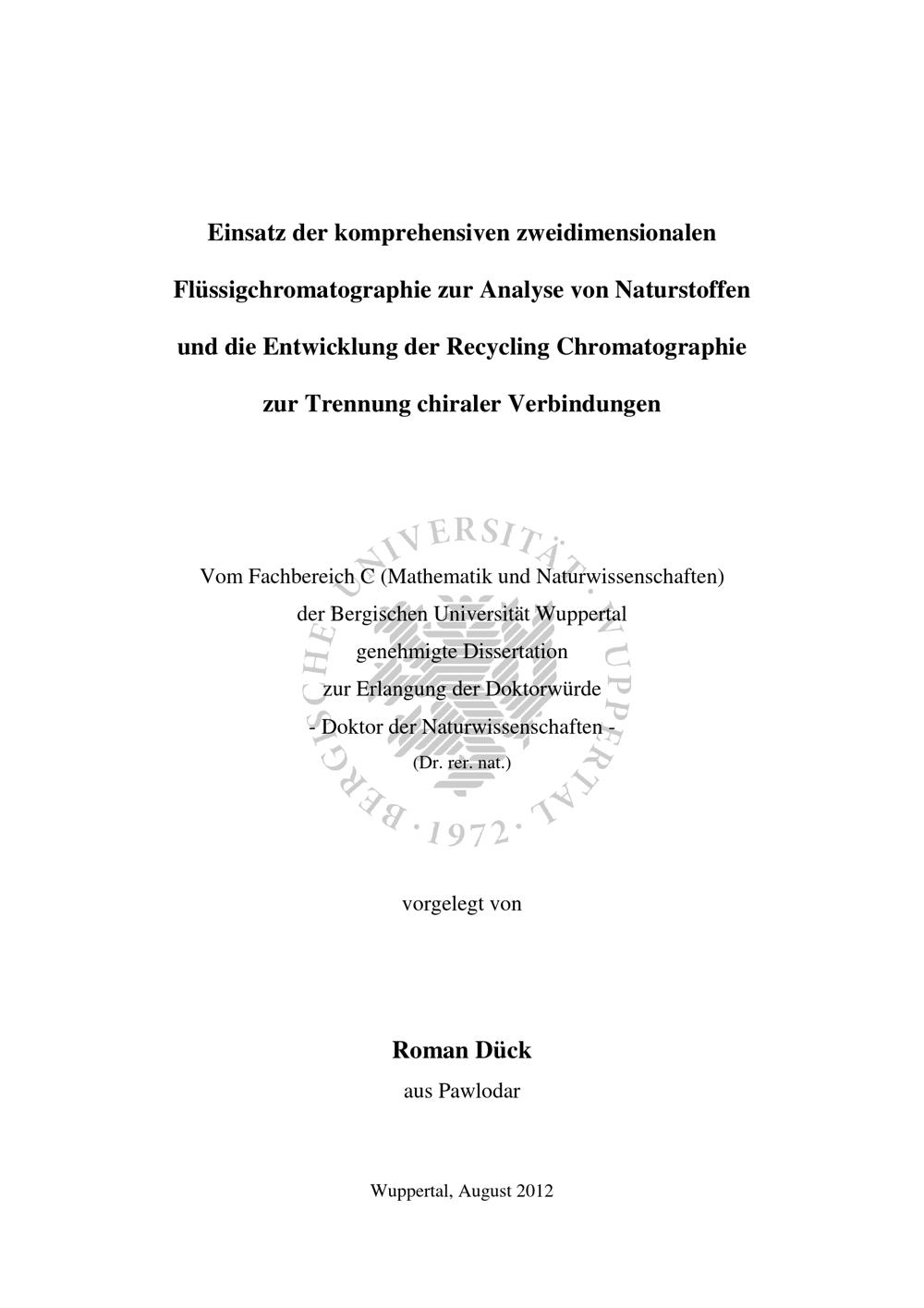 Einsatz der komprehensiven zweidimensionalen Flüssigchromatographie zur Analyse von Naturstoffen und die Entwicklung der Recycling-Chromatographie zur Trennung chiraler Verbindungen / vorgelegt von Roman Dück