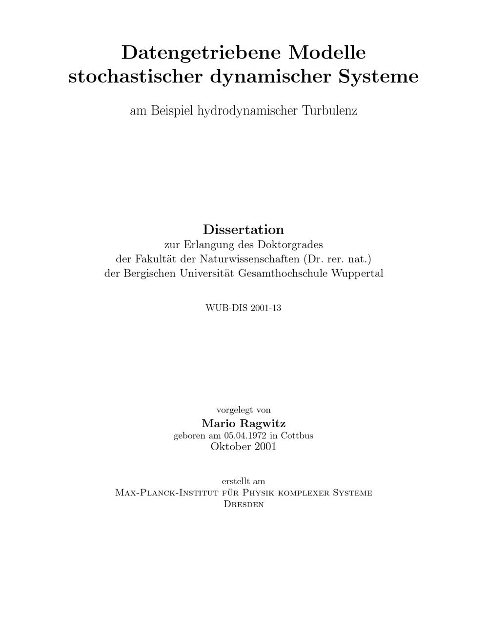 Datengetriebene Modelle stochastischer dynamischer Systeme : am Beispiel hydrodynamischer Turbulenz / vorgelegt von Mario Ragwitz