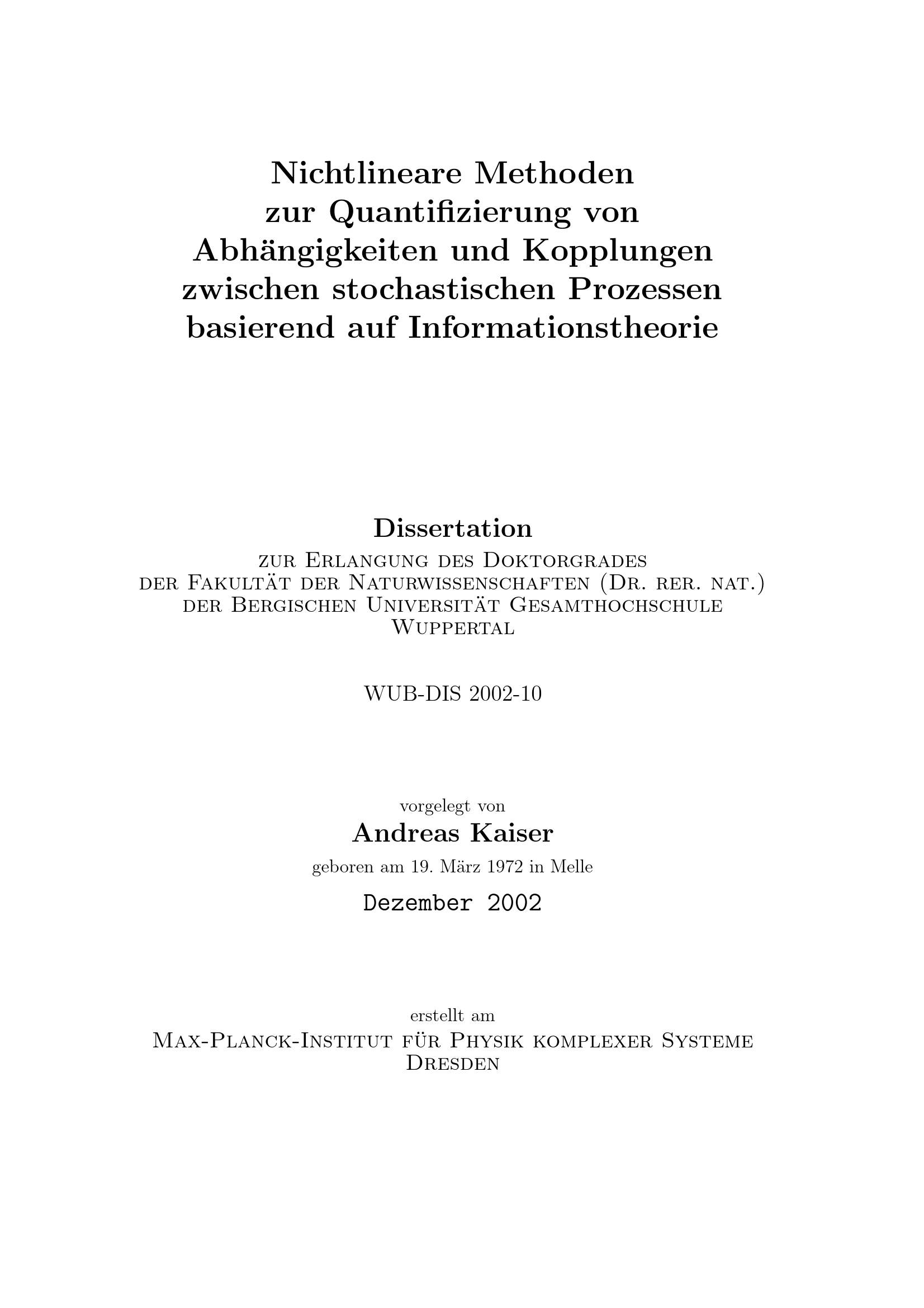 Nichtlineare Methoden zur Quantifizierung von Abhängigkeiten und Kopplungen zwischen stochastischen Prozessen basierend auf Informationstheorie / vorgelegt von Andreas Kaiser