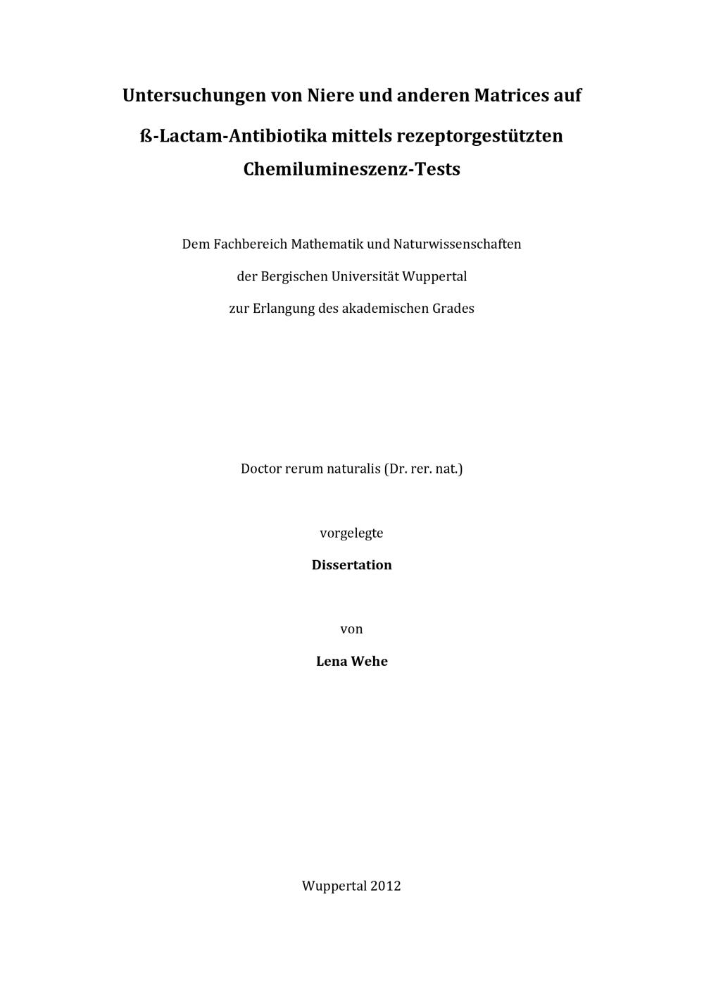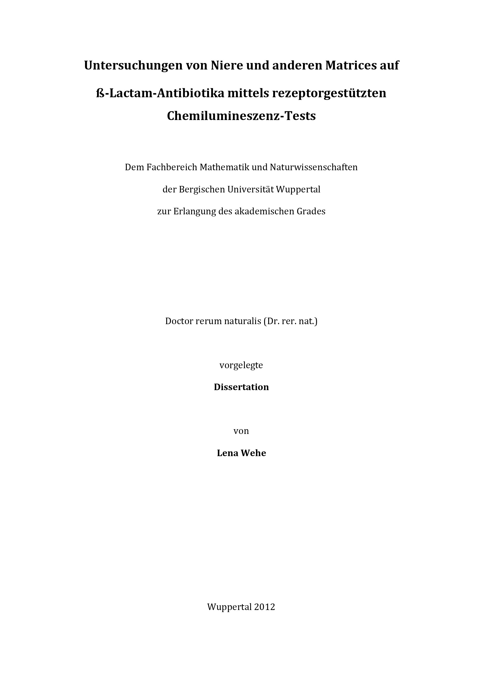Untersuchungen von Niere und anderen Matrices auf beta-Lactam-Antibiotika mittels rezeptorgestützten Chemilumineszenz-Tests / von Lena Wehe