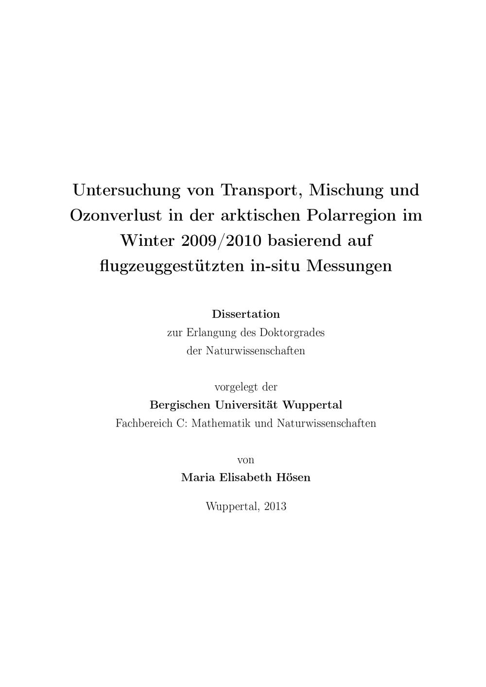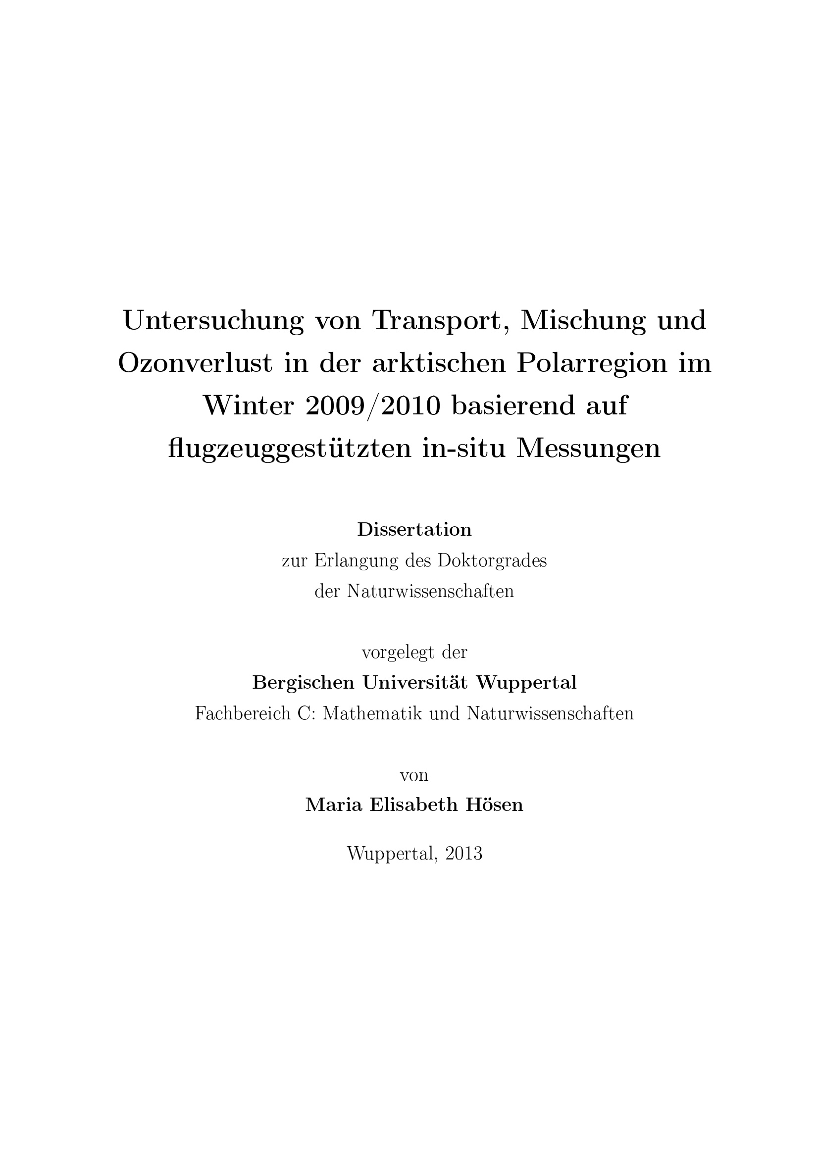 Untersuchung von Transport, Mischung und Ozonverlust in der arktischen Polarregion im Winter 2009, 2010 basierend auf flugzeuggestützten In-situ-Messungen / vorgelegt von Maria Elisabeth Hösen