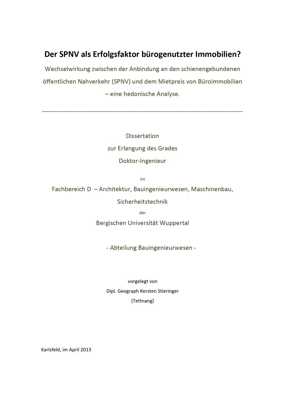 Der SPNV als Erfolgsfaktor bürogenutzter Immobilien? : Wechselwirkung zwischen der Anbindung an den schienengebundenen öffentlichen Nahverkehr (SPNV) und dem Mietpreis von Büroimmobilien ; eine hedonische Analyse / vorgelegt von Kersten Stieringer