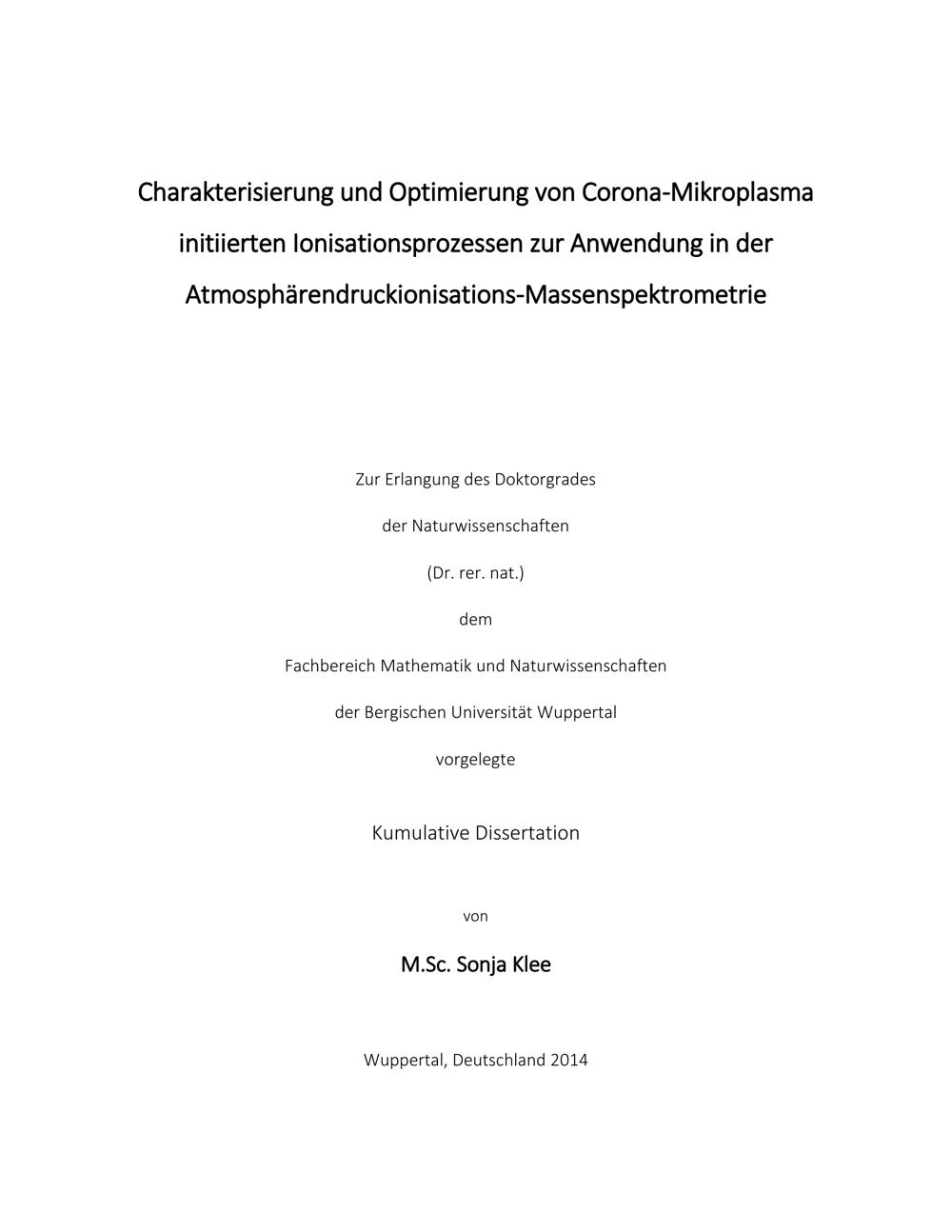 Charakterisierung und Optimierung von Corona-Mikroplasma-initiierten Ionisationsprozessen zur Anwendung in der Atmosphärendruckionisations-Massenspektrometrie : kumulative Dissertation / von Sonja Klee