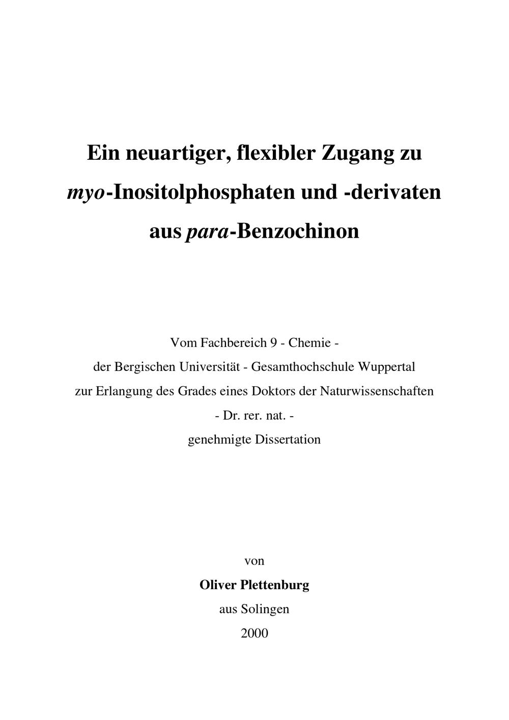 Ein neuartiger, flexibler Zugang zu myo-Inositolphosphaten und -derivaten aus para-Benzochinon / von Oliver Plettenburg