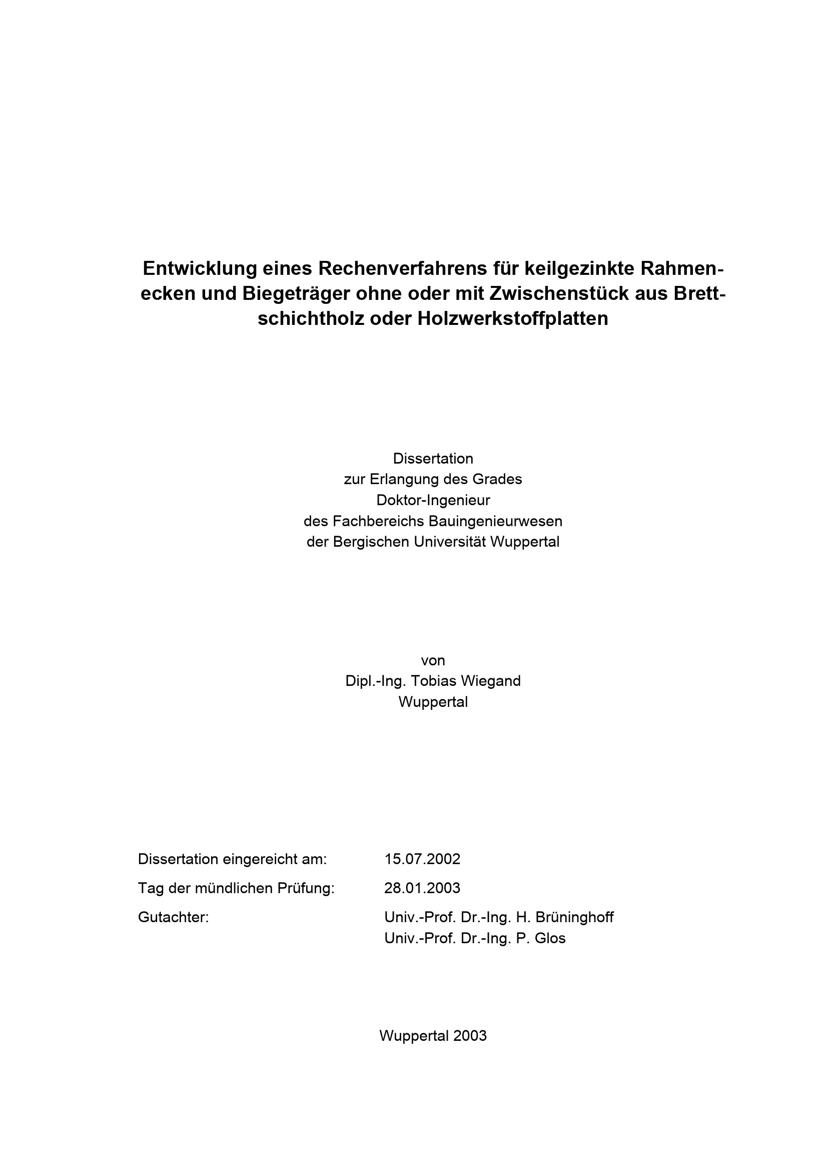 Entwicklung eines Rechenverfahrens für keilgezinkte Rahmenecken und Biegeträger ohne oder mit Zwischenstück aus Brettschichtholz oder Holzwerkstoffplatten / von Tobias Wiegand