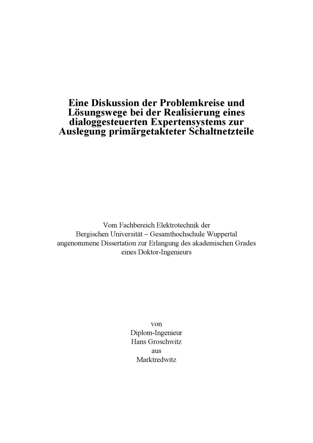 Eine Diskussion der Problemkreise und Lösungswege bei der Realisierung eines dialoggesteuerten Expertensystems zur Auslegung primärgetakteter Schaltnetzteile / von Hans Groschwitz