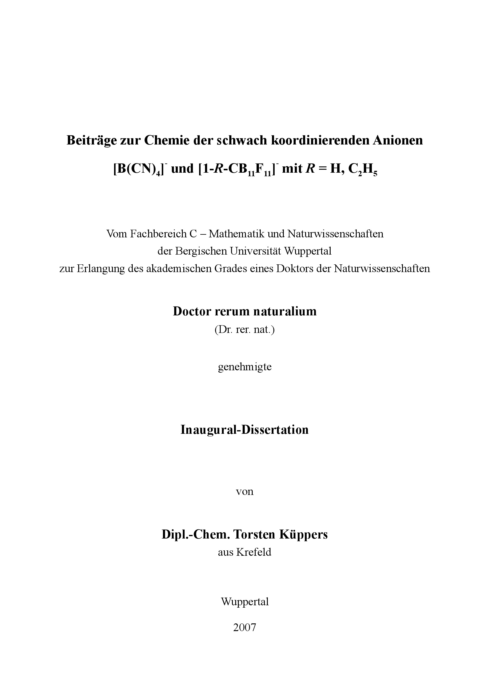 Beiträge zur Chemie der schwach koordinierenden Anionen (B(CN) 4) - und (1-R-CB 11 F 11) - mit R = H, C 2 H 5 / von Torsten Küppers