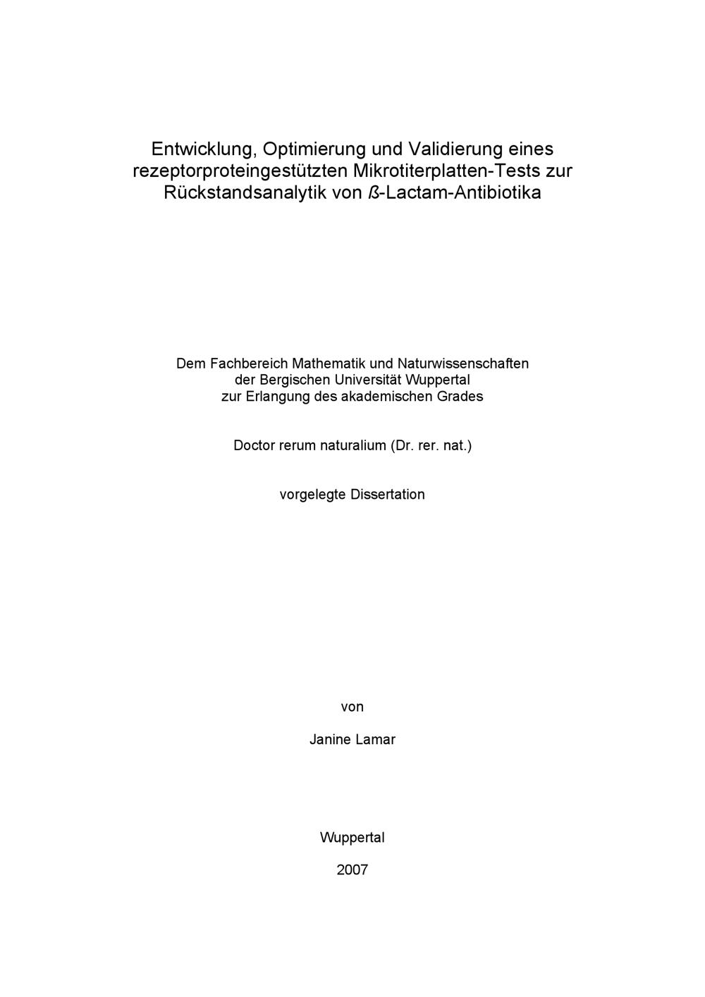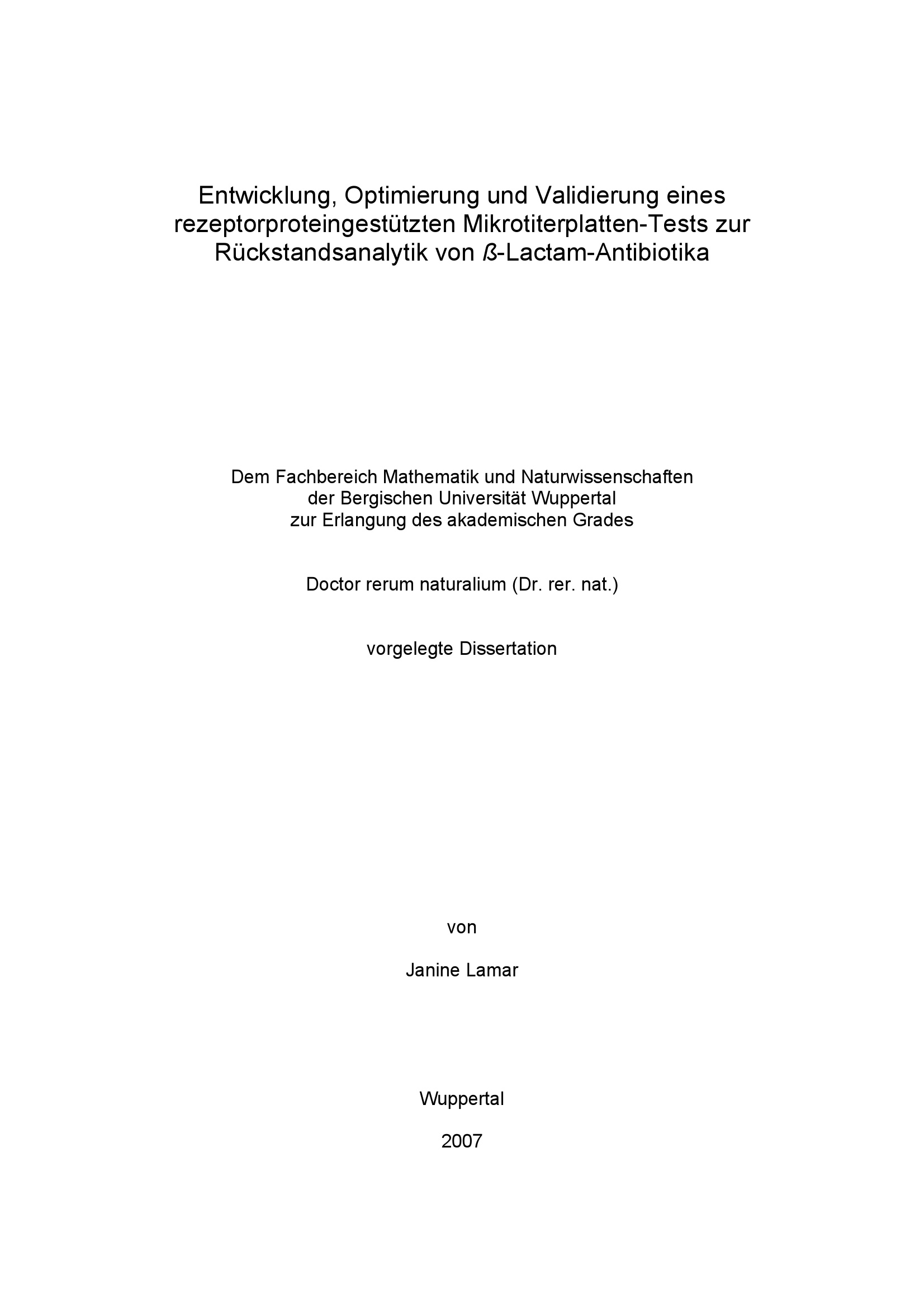 Entwicklung, Optimierung und Validierung eines rezeptorproteingestützten Mikrotiterplatten-Tests zur Rückstandsanalytik von beta-Lactam-Antibiotika / von Janine Lamar