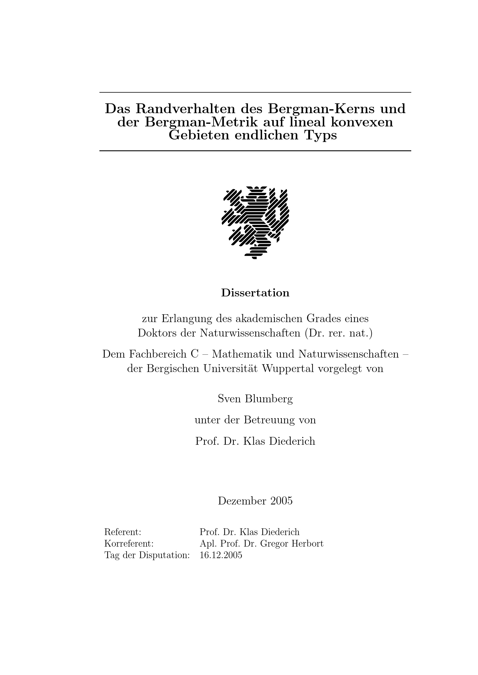 Das Randverhalten des Bergman-Kerns und der Bergman-Metrik auf lineal konvexen Gebieten endlichen Typs / vorgelegt von Sven Blumberg