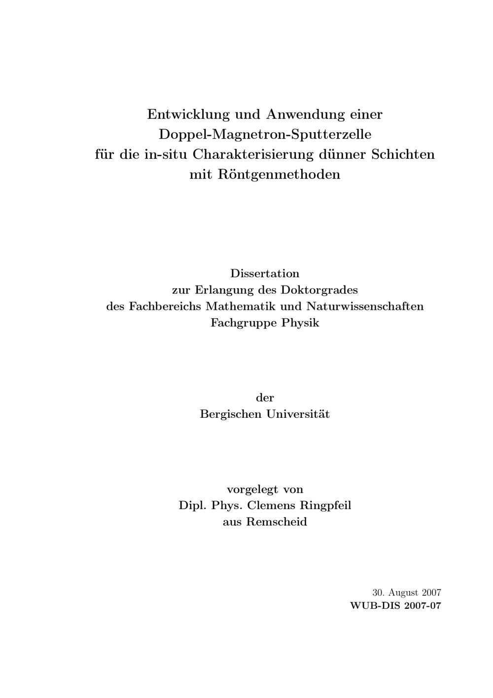 Entwicklung und Anwendung einer Doppel-Magnetron-Sputterzelle für die In-situ-Charakterisierung dünner Schichten mit Röntgenmethoden / vorgelegt von Clemens Ringpfeil