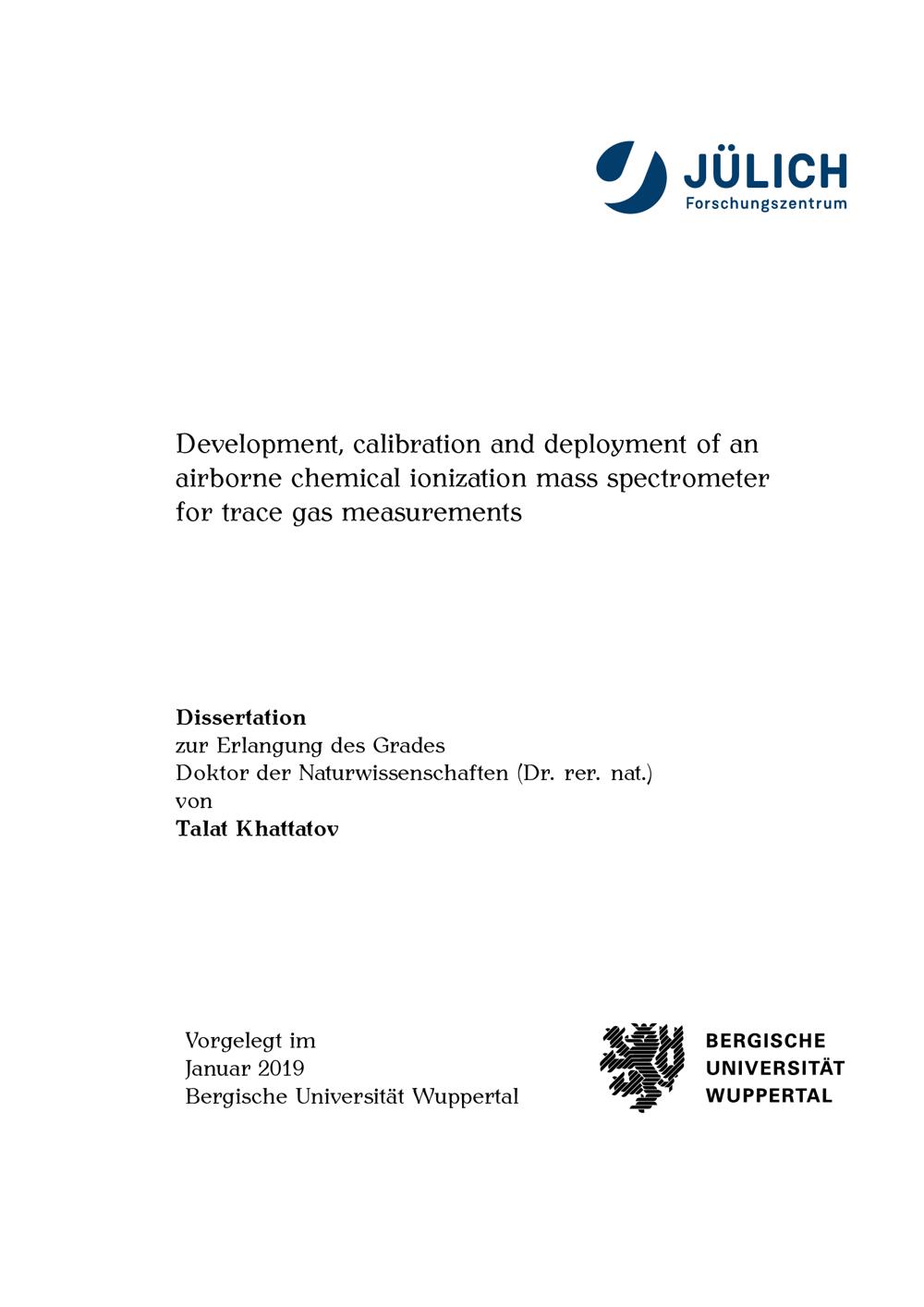 Development, calibration and deployment of an airborne chemical ionization mass spectrometer for trace gas measurements / Talat Khattatov