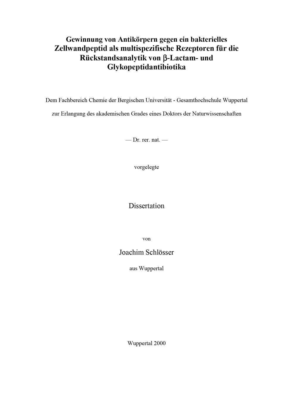 Gewinnung von Antikörpern gegen ein bakterielles Zellwandpeptid als multispezifische Rezeptoren für die Rückstandsanalytik von beta-Lactam- und Glykopeptidantibiotika / von Joachim Schlösser